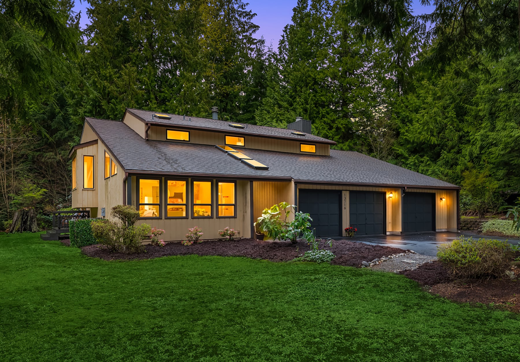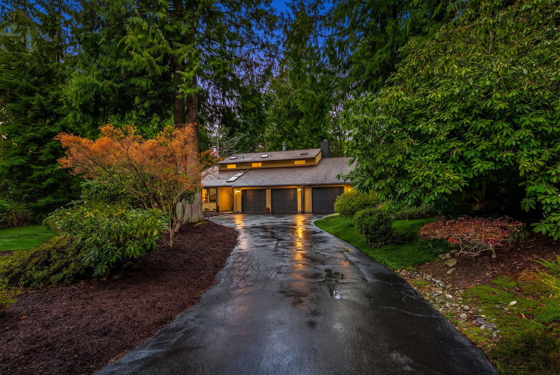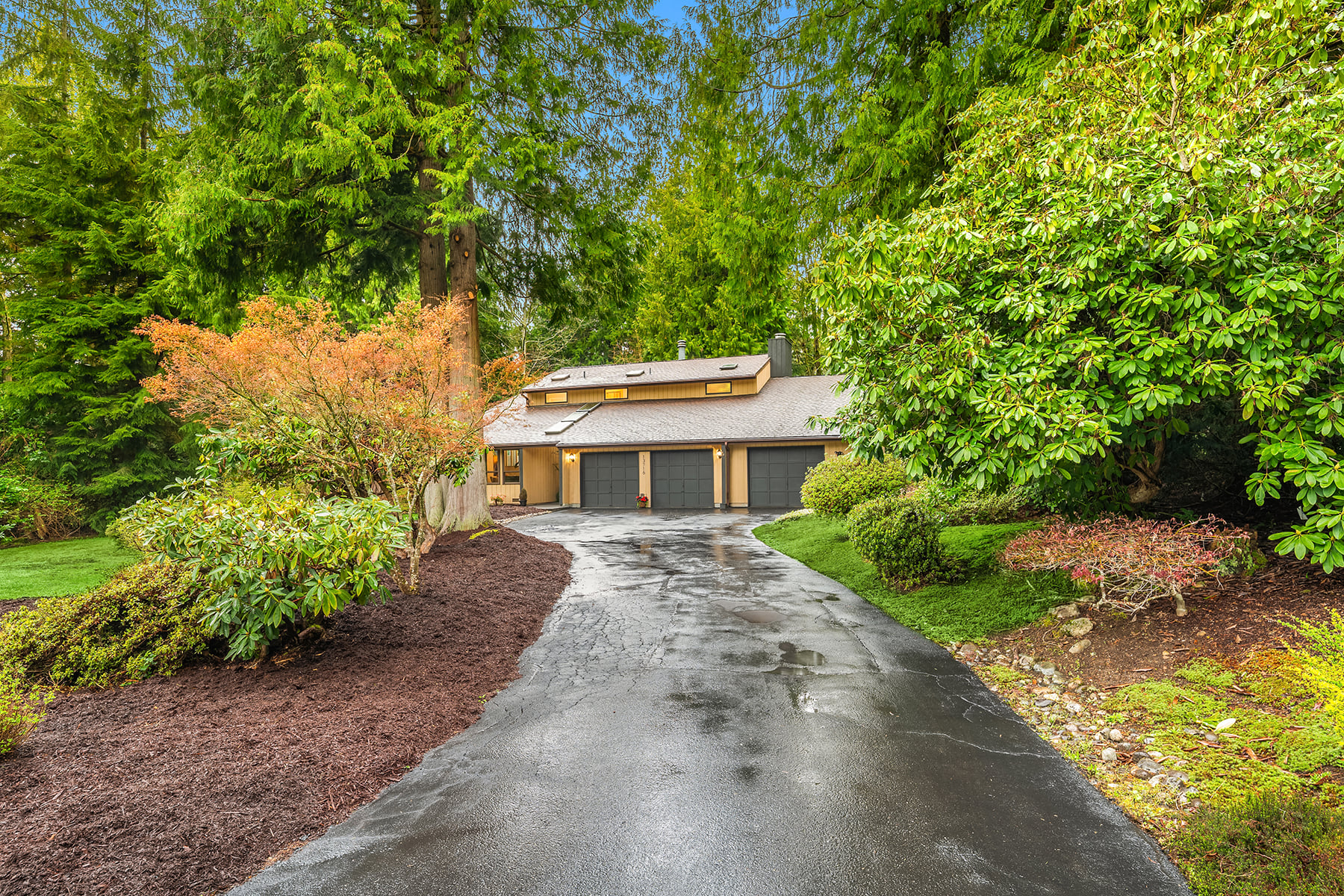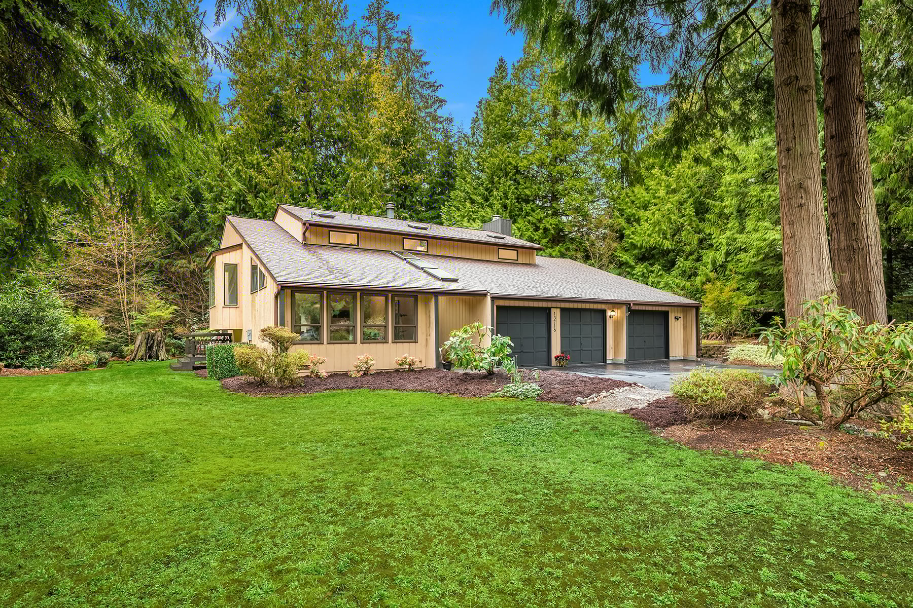 Shy Acre Wonderland ~ Privately nestled down on a long wooded drive at the end of a cul-de-sac in coveted Wingate at Picnic Point, this northwest contemporary stunner dazzles with captivating curb appeal in a fairy tale setting with high-end modern upgrades throughout! Boasting dramatic architecture wrapped in windows with soaring open beam ceilings & breathtaking forest views at every turn. Brilliantly reimagined, the 2,046sf open concept two-story features an irresistible designer kitchen with sleek black cabinets, waterfall-edge quartz counters, custom steel hood, satin brass accents, wrap-around wall-to-wall tile backsplash, center island bar, exquisite hand blown Italian pendants & Bocchi Fireclay apron sink flanked by family room with wood-burning fireplace & dining space with slider to sun deck. Spacious vaulted living room with clearstory windows & open rail staircase. Magnificent primary suite with cathedral ceilings, towering fireplace, sitting area, walk-in closet, lavish tiled bath with skylight & extended covered balcony. Generous vaulted bedrooms & remodeled baths + secret den/bonus room off the 833sf 3-car dream garage. A turn-key masterpiece with gorgeous wide-planked LVP floors, new plush carpets, upscale millwork & fresh paint throughout. Secluded backyard sanctuary backed to lush evergreens features sprawling entertainment patio, fire pit, premium hot tub & wooded hiking trails. Just a short walk to Serene Lake Elementary. You'll love it here. Welcome home!