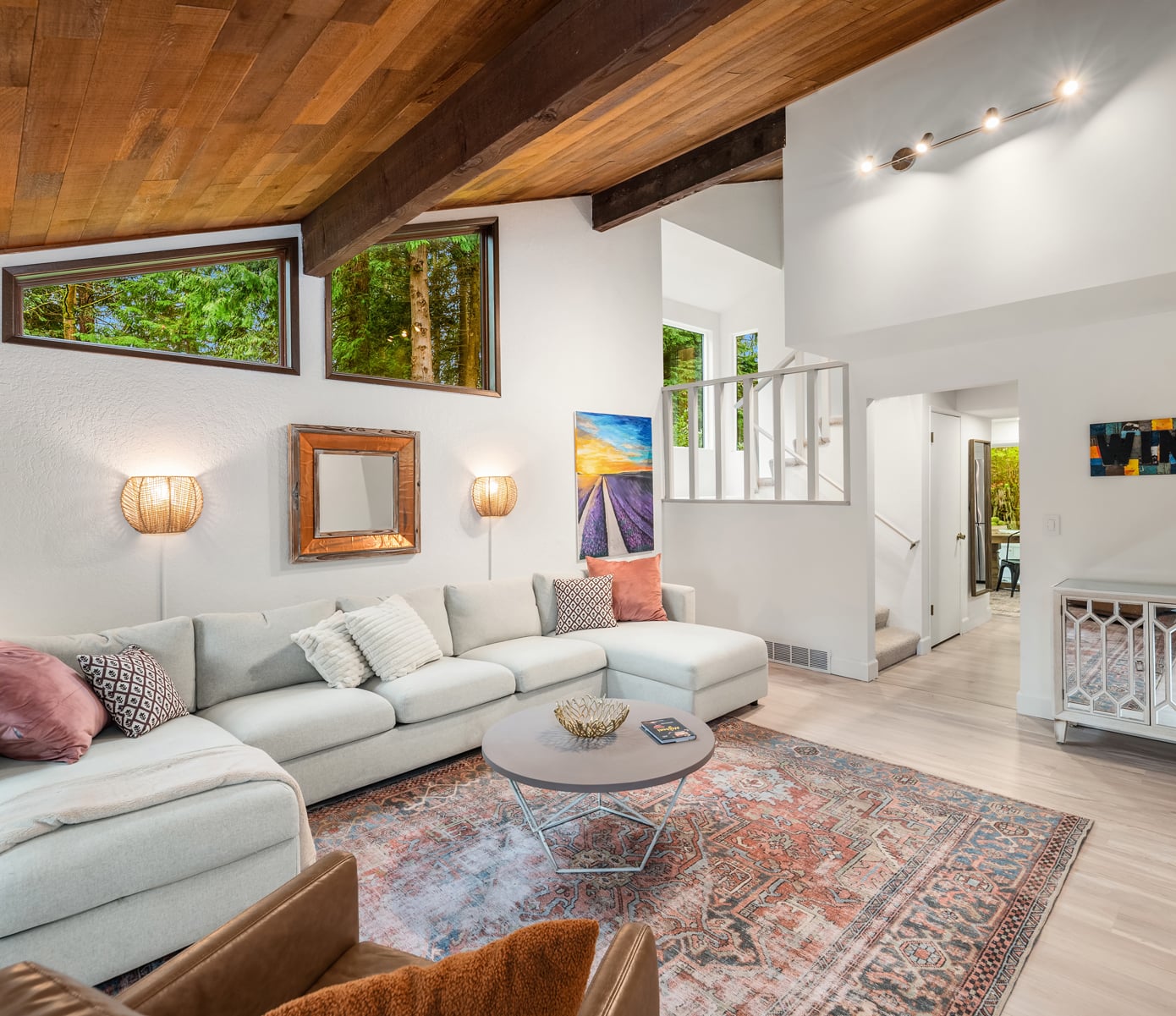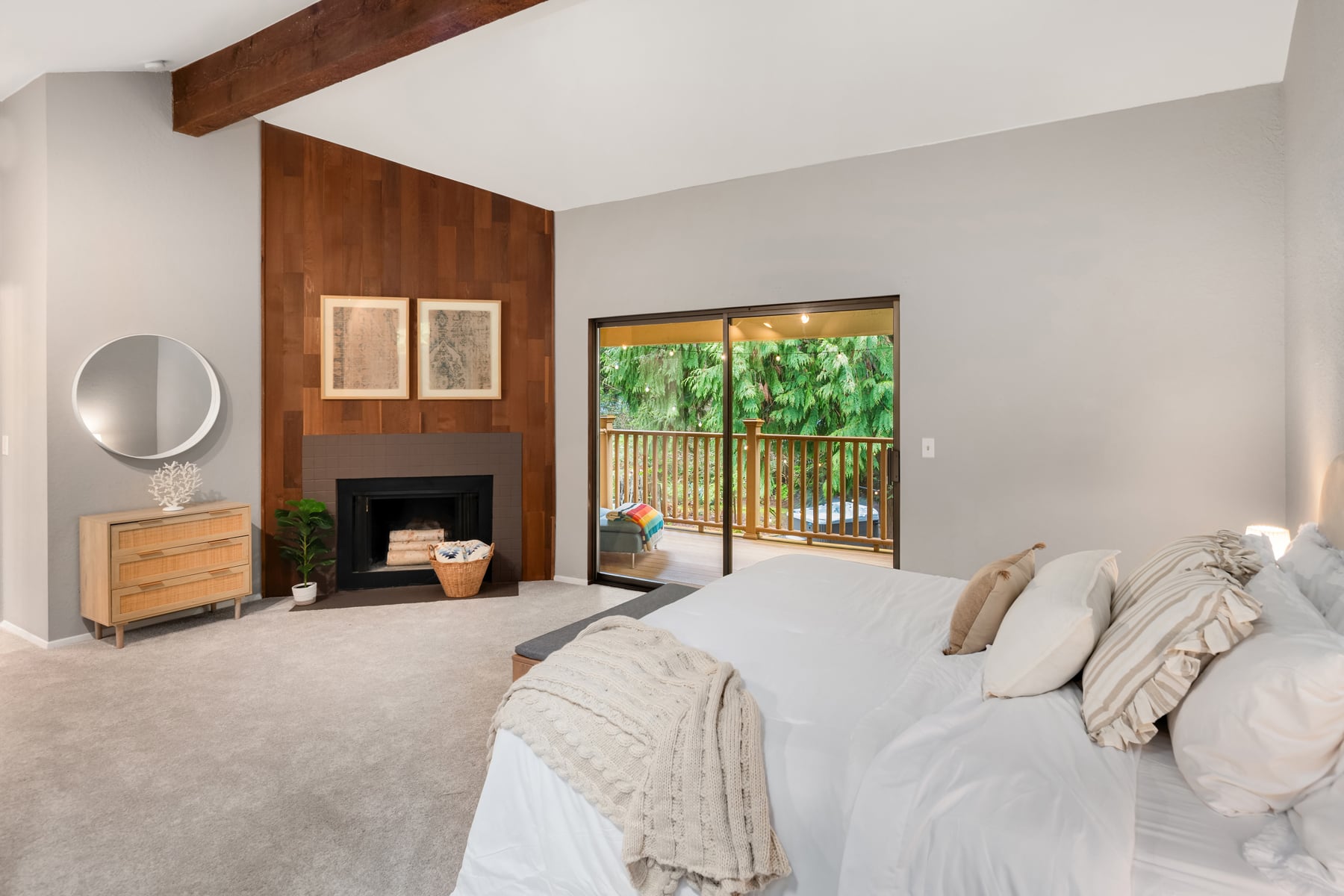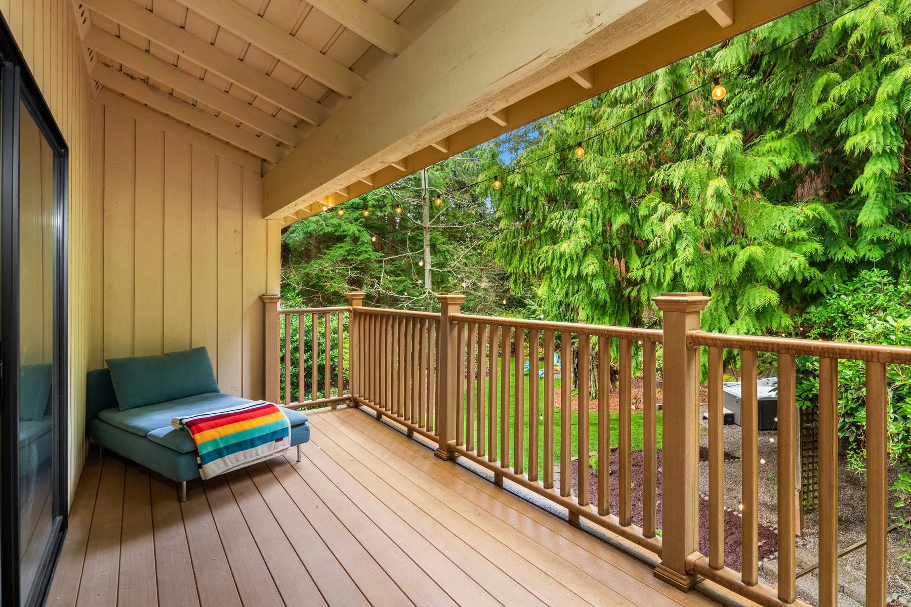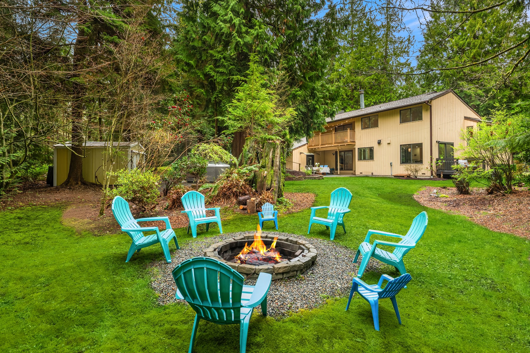 Shy Acre Wonderland ~ Privately nestled down on a long wooded drive at the end of a cul-de-sac in coveted Wingate at Picnic Point, this northwest contemporary stunner dazzles with captivating curb appeal in a fairy tale setting with high-end modern upgrades throughout! Boasting dramatic architecture wrapped in windows with soaring open beam ceilings & breathtaking forest views at every turn. Brilliantly reimagined, the 2,046sf open concept two-story features an irresistible designer kitchen with sleek black cabinets, waterfall-edge quartz counters, custom steel hood, satin brass accents, wrap-around wall-to-wall tile backsplash, center island bar, exquisite hand blown Italian pendants & Bocchi Fireclay apron sink flanked by family room with wood-burning fireplace & dining space with slider to sun deck. Spacious vaulted living room with clearstory windows & open rail staircase. Magnificent primary suite with cathedral ceilings, towering fireplace, sitting area, walk-in closet, lavish tiled bath with skylight & extended covered balcony. Generous vaulted bedrooms & remodeled baths + secret den/bonus room off the 833sf 3-car dream garage. A turn-key masterpiece with gorgeous wide-planked LVP floors, new plush carpets, upscale millwork & fresh paint throughout. Secluded backyard sanctuary backed to lush evergreens features sprawling entertainment patio, fire pit, premium hot tub & wooded hiking trails. Just a short walk to Serene Lake Elementary. You'll love it here. Welcome home!