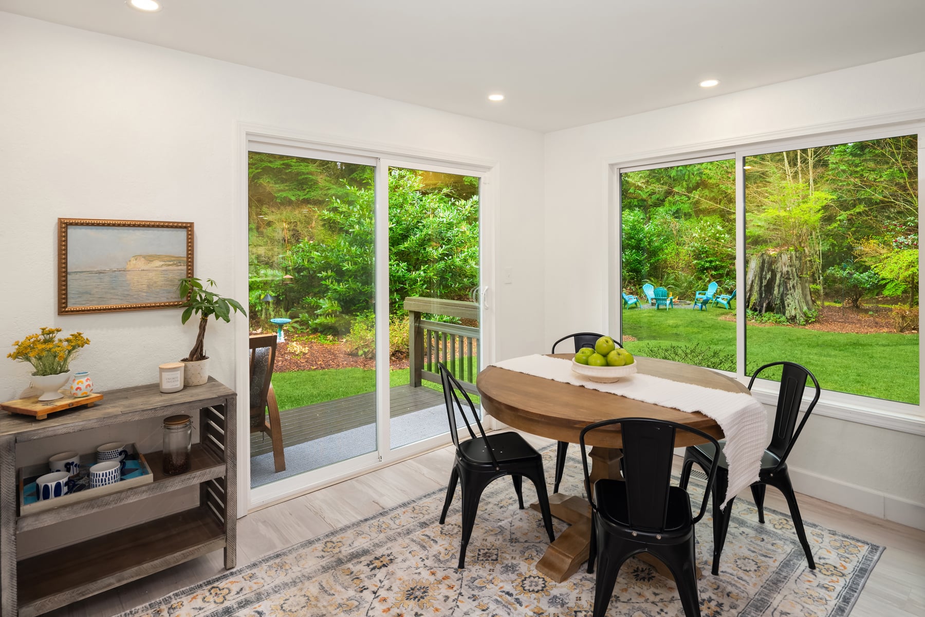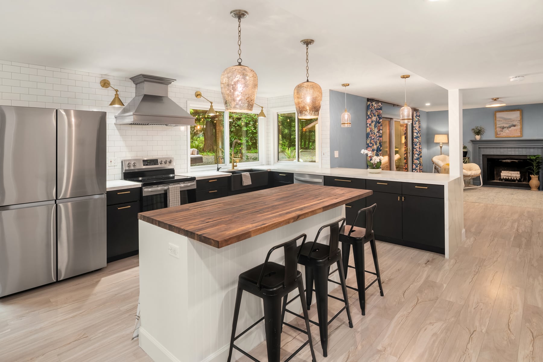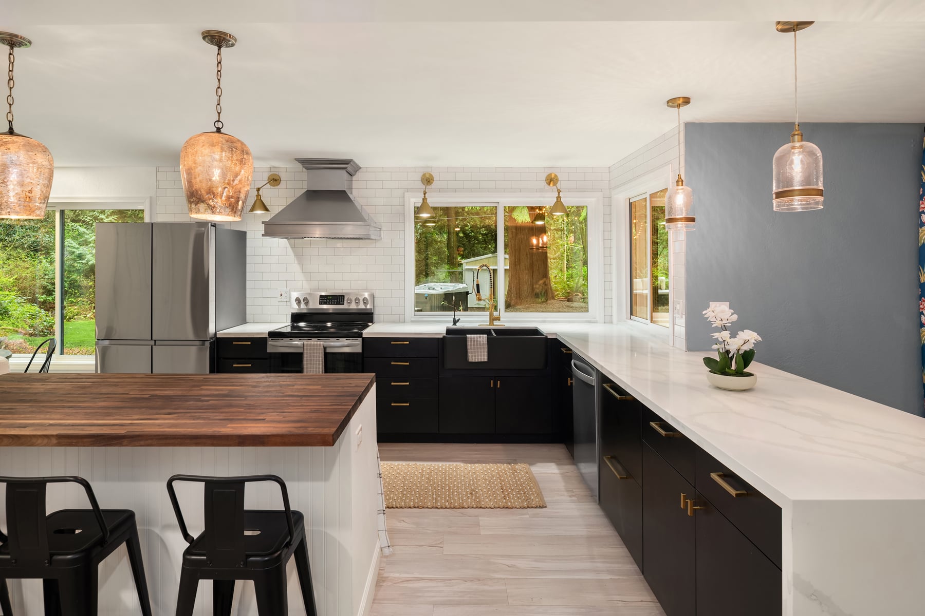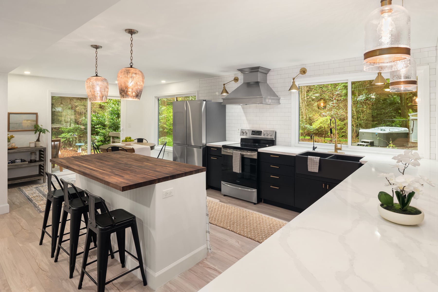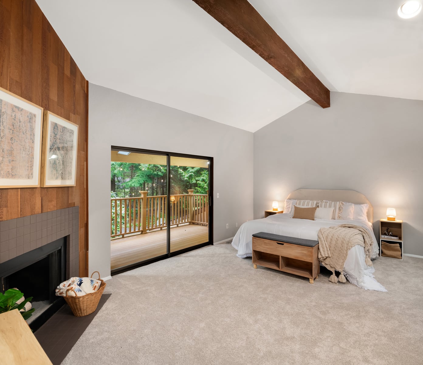 Shy Acre Wonderland ~ Privately nestled down on a long wooded drive at the end of a cul-de-sac in coveted Wingate at Picnic Point, this northwest contemporary stunner dazzles with captivating curb appeal in a fairy tale setting with high-end modern upgrades throughout! Boasting dramatic architecture wrapped in windows with soaring open beam ceilings & breathtaking forest views at every turn. Brilliantly reimagined, the 2,046sf open concept two-story features an irresistible designer kitchen with sleek black cabinets, waterfall-edge quartz counters, custom steel hood, satin brass accents, wrap-around wall-to-wall tile backsplash, center island bar, exquisite hand blown Italian pendants & Bocchi Fireclay apron sink flanked by family room with wood-burning fireplace & dining space with slider to sun deck. Spacious vaulted living room with clearstory windows & open rail staircase. Magnificent primary suite with cathedral ceilings, towering fireplace, sitting area, walk-in closet, lavish tiled bath with skylight & extended covered balcony. Generous vaulted bedrooms & remodeled baths + secret den/bonus room off the 833sf 3-car dream garage. A turn-key masterpiece with gorgeous wide-planked LVP floors, new plush carpets, upscale millwork & fresh paint throughout. Secluded backyard sanctuary backed to lush evergreens features sprawling entertainment patio, fire pit, premium hot tub & wooded hiking trails. Just a short walk to Serene Lake Elementary. You'll love it here. Welcome home!