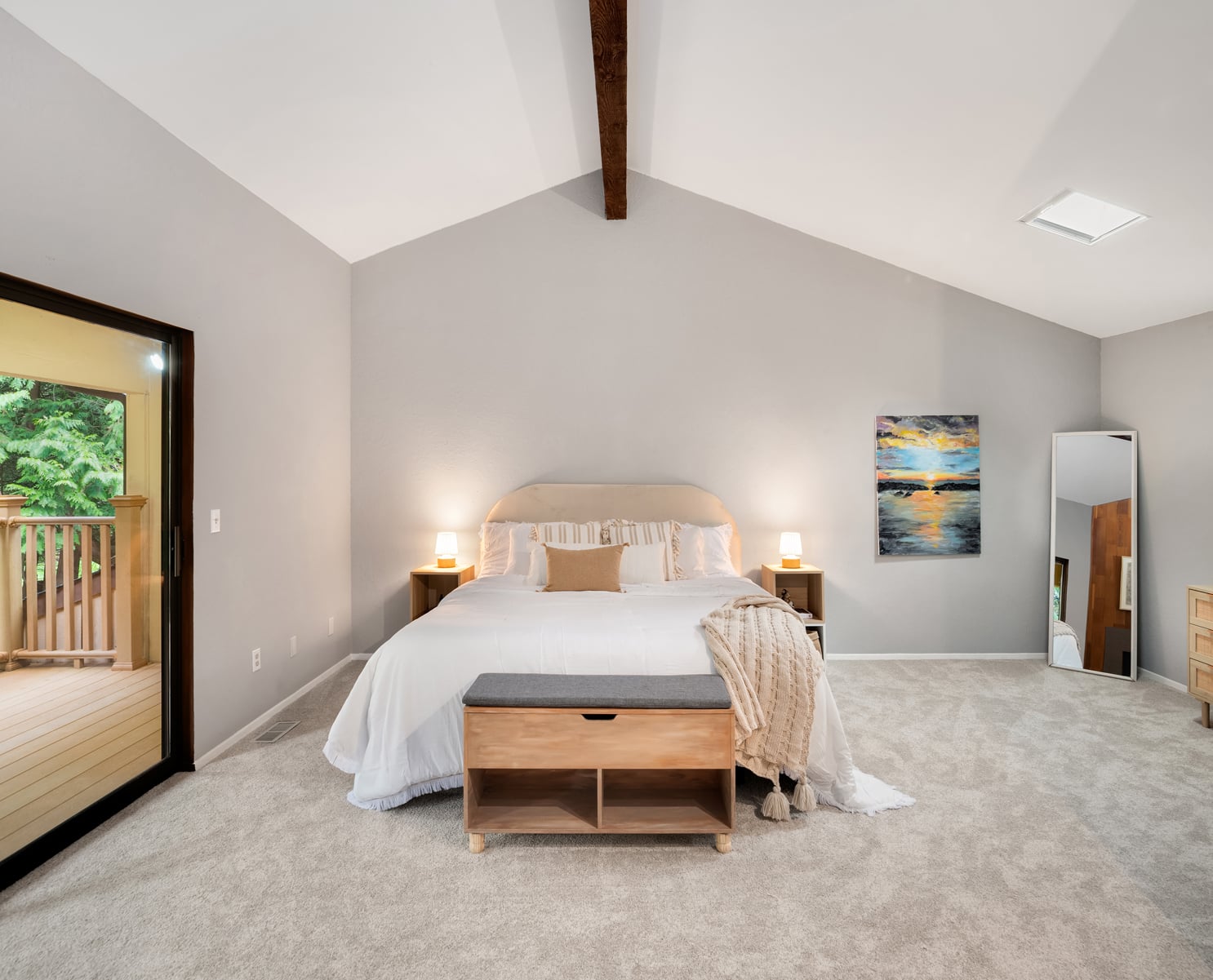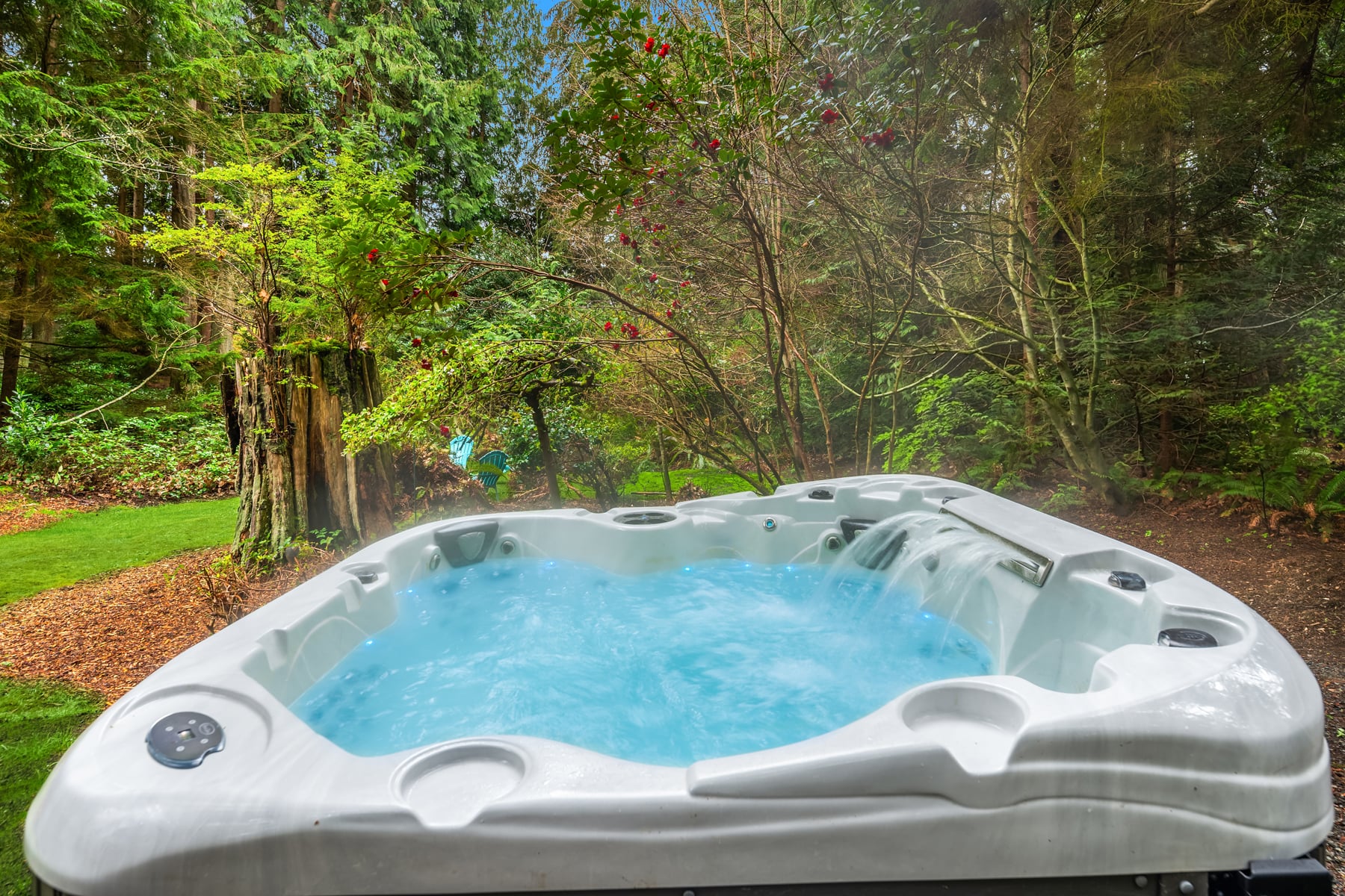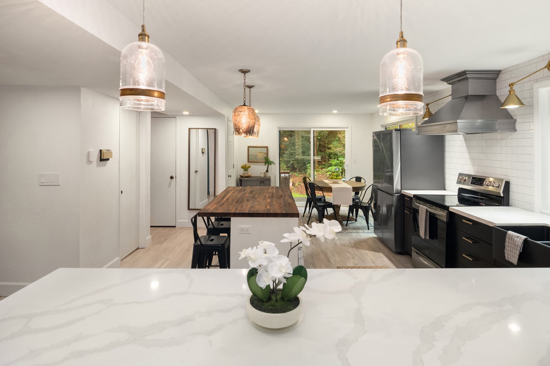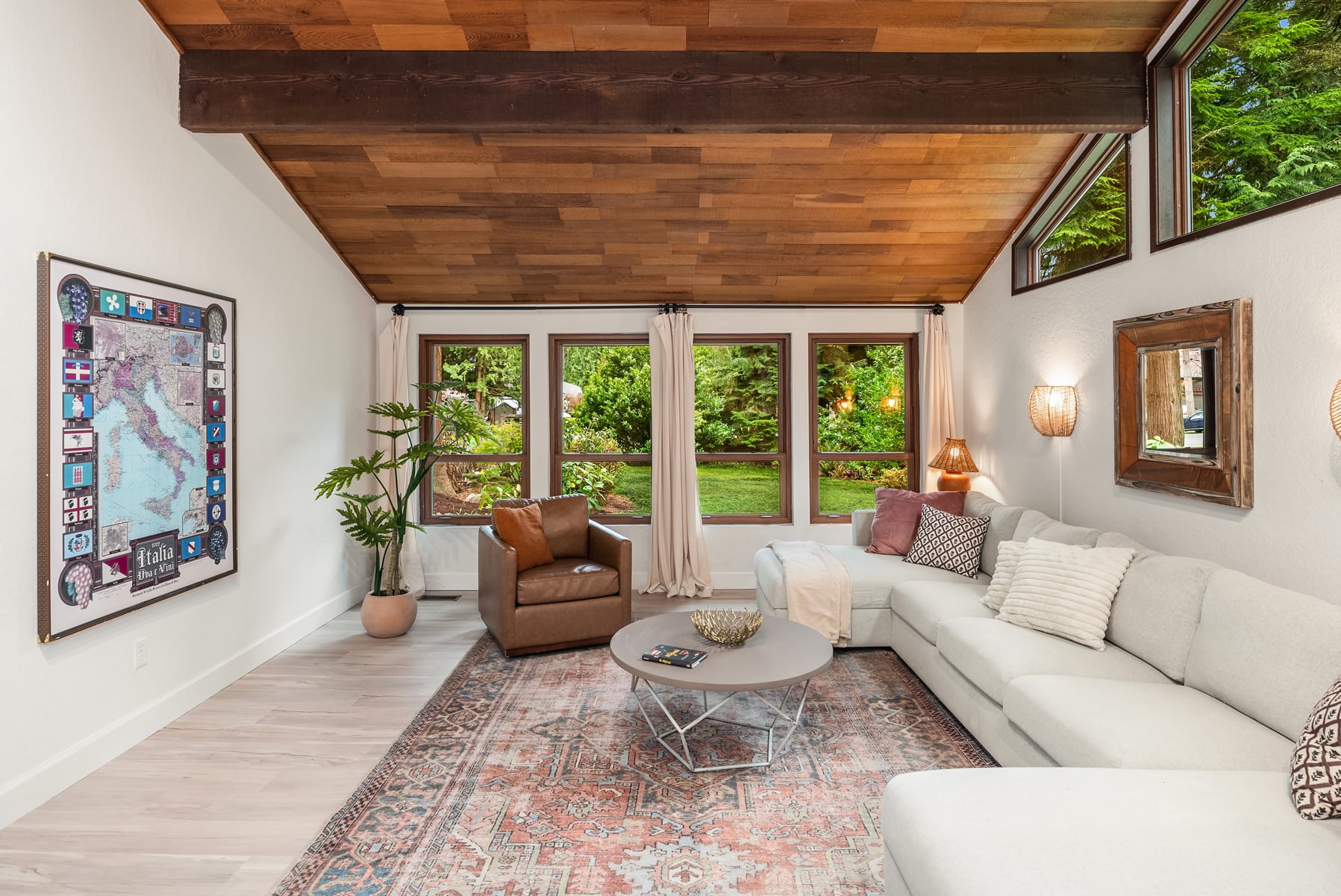 Shy Acre Wonderland ~ Privately nestled down on a long wooded drive at the end of a cul-de-sac in coveted Wingate at Picnic Point, this northwest contemporary stunner dazzles with captivating curb appeal in a fairy tale setting with high-end modern upgrades throughout! Boasting dramatic architecture wrapped in windows with soaring open beam ceilings & breathtaking forest views at every turn. Brilliantly reimagined, the 2,046sf open concept two-story features an irresistible designer kitchen with sleek black cabinets, waterfall-edge quartz counters, custom steel hood, satin brass accents, wrap-around wall-to-wall tile backsplash, center island bar, exquisite hand blown Italian pendants & Bocchi Fireclay apron sink flanked by family room with wood-burning fireplace & dining space with slider to sun deck. Spacious vaulted living room with clearstory windows & open rail staircase. Magnificent primary suite with cathedral ceilings, towering fireplace, sitting area, walk-in closet, lavish tiled bath with skylight & extended covered balcony. Generous vaulted bedrooms & remodeled baths + secret den/bonus room off the 833sf 3-car dream garage. A turn-key masterpiece with gorgeous wide-planked LVP floors, new plush carpets, upscale millwork & fresh paint throughout. Secluded backyard sanctuary backed to lush evergreens features sprawling entertainment patio, fire pit, premium hot tub & wooded hiking trails. Just a short walk to Serene Lake Elementary. You'll love it here. Welcome home!