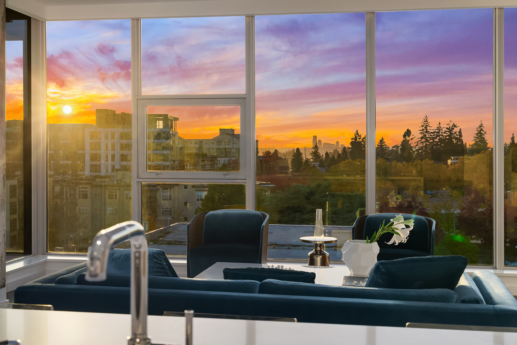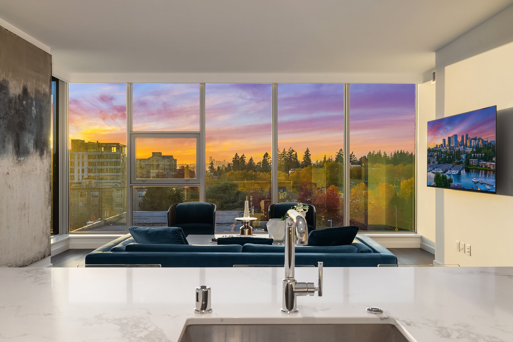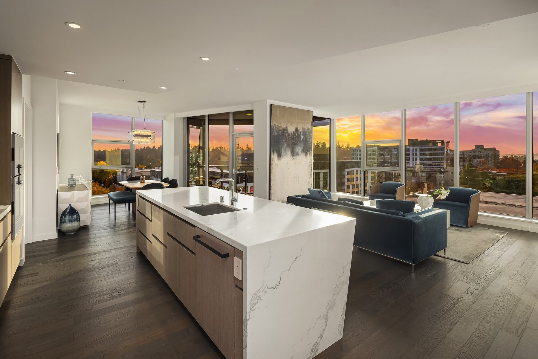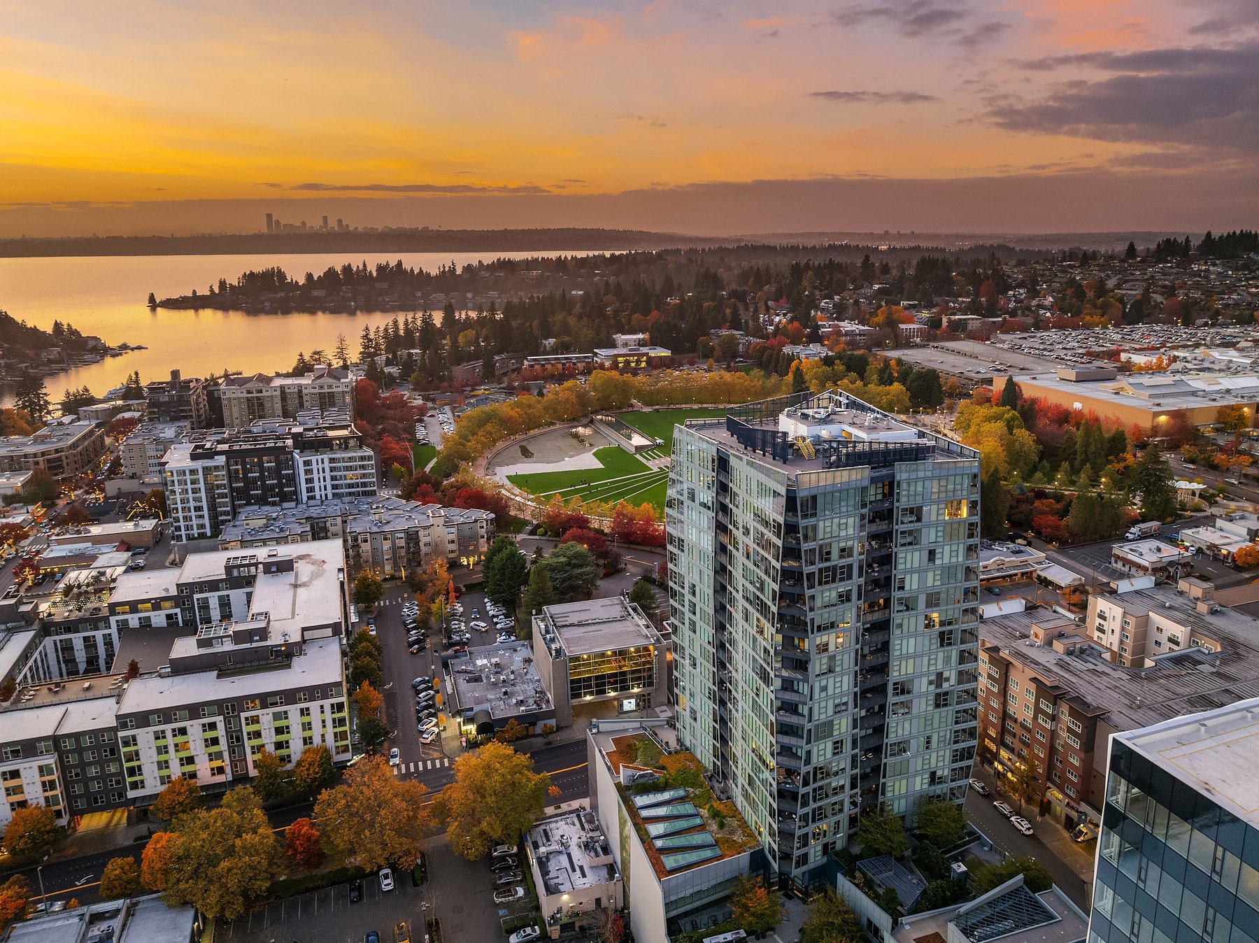 Boasting one of the most spectacular vantage points in the city, this SW corner unit dazzles with sweeping views from Downtown Bellevue Park & Meydenbauer Bay to Downtown Seattle, the Olympics & Mount Rainier! Drenched in natural light, the sprawling 1450sf floorplan is a coveted find with private foyer, split-bedroom layout & extended indoor/outdoor balcony. Sophisticated modern finishes & high-end upgrades throughout. Showcase kitchen with waterfall island & Gaggenau paneled appliances. Remote shades, 2 premium parking spots, EV charger & extra storage + Designer furnishings included. Glamorous high-rise amenities: 24-hour concierge, pool, spa, sauna, gym, virtual golf, owners lounge & garden terrace + luxury shops & fine dining at your door!
