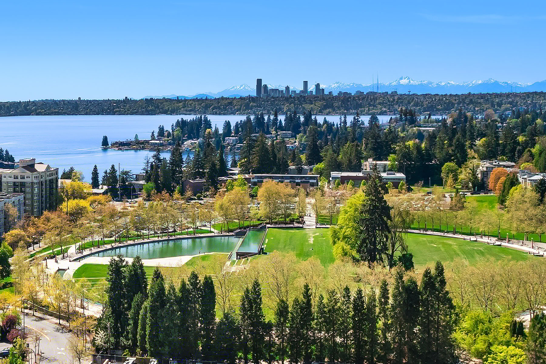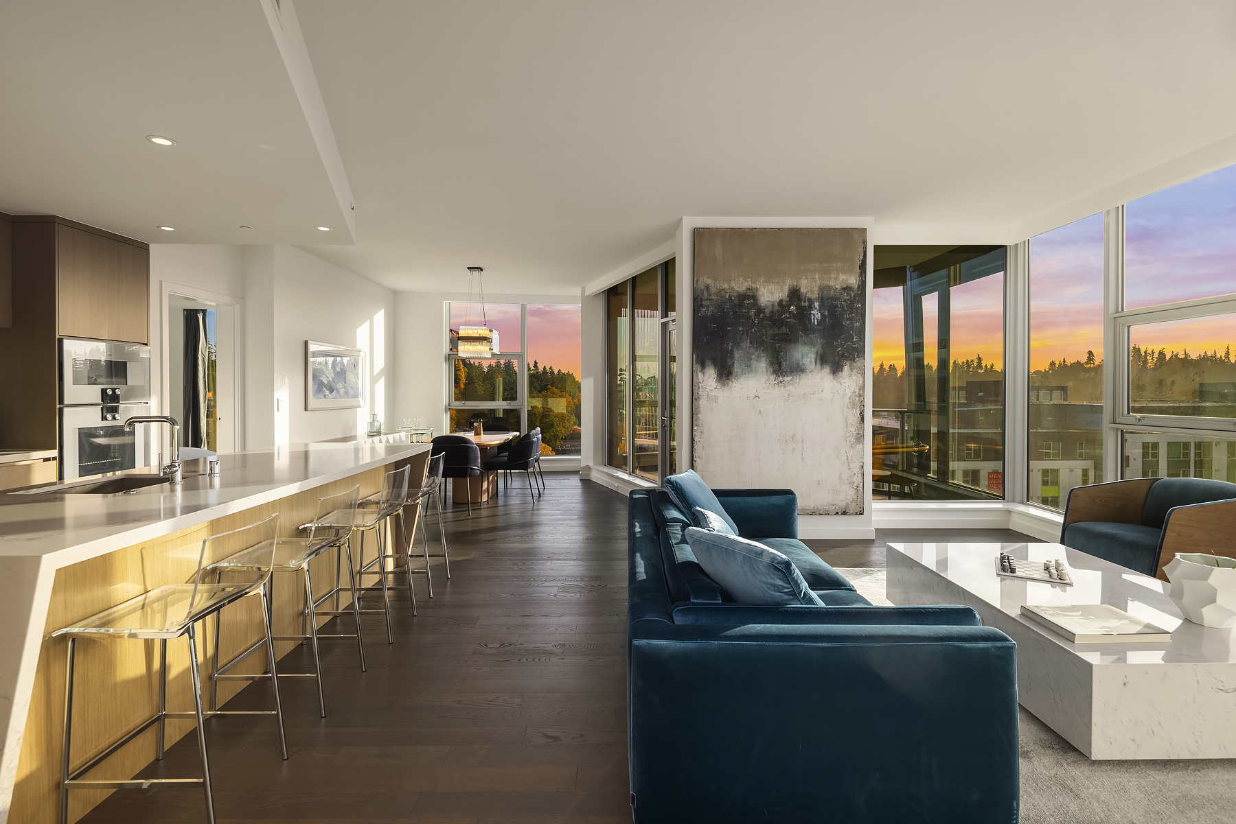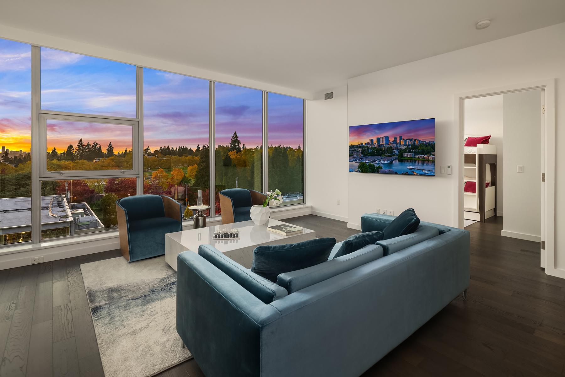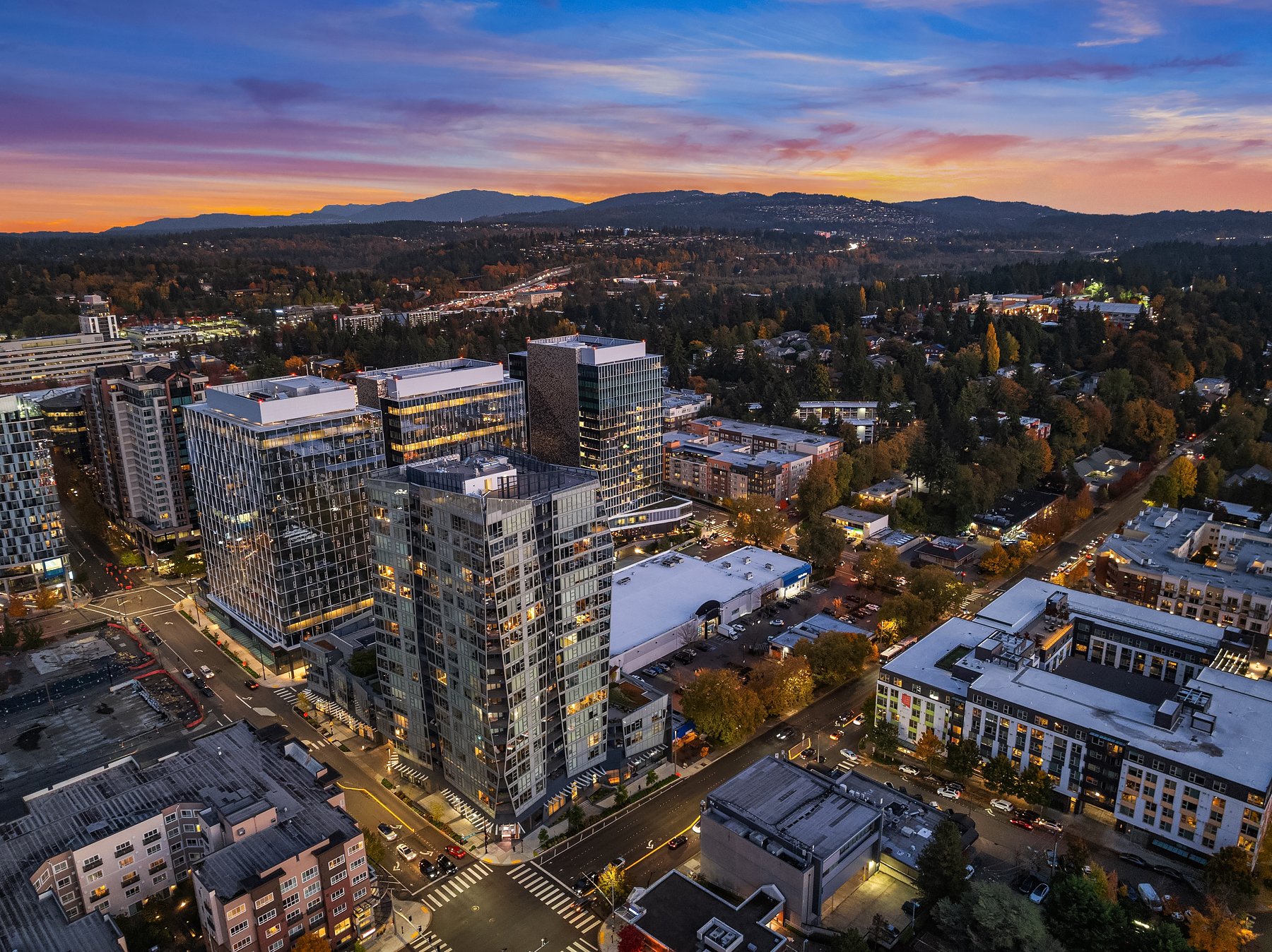 Boasting one of the most spectacular vantage points in the city, this SW corner unit dazzles with sweeping views from Downtown Bellevue Park & Meydenbauer Bay to Downtown Seattle, the Olympics & Mount Rainier! Drenched in natural light, the sprawling 1450sf floorplan is a coveted find with private foyer, split-bedroom layout & extended indoor/outdoor balcony. Sophisticated modern finishes & high-end upgrades throughout. Showcase kitchen with waterfall island & Gaggenau paneled appliances. Remote shades, 2 premium parking spots, EV charger & extra storage + Designer furnishings included. Glamorous high-rise amenities: 24-hour concierge, pool, spa, sauna, gym, virtual golf, owners lounge & garden terrace + luxury shops & fine dining at your door!