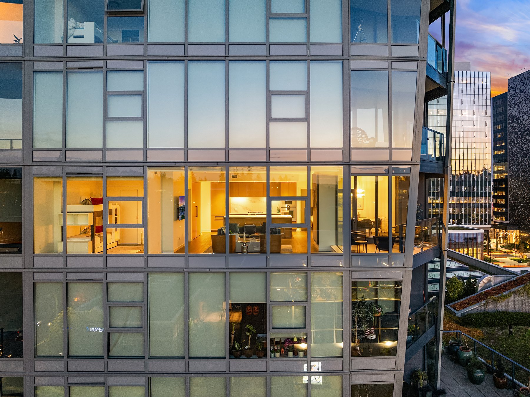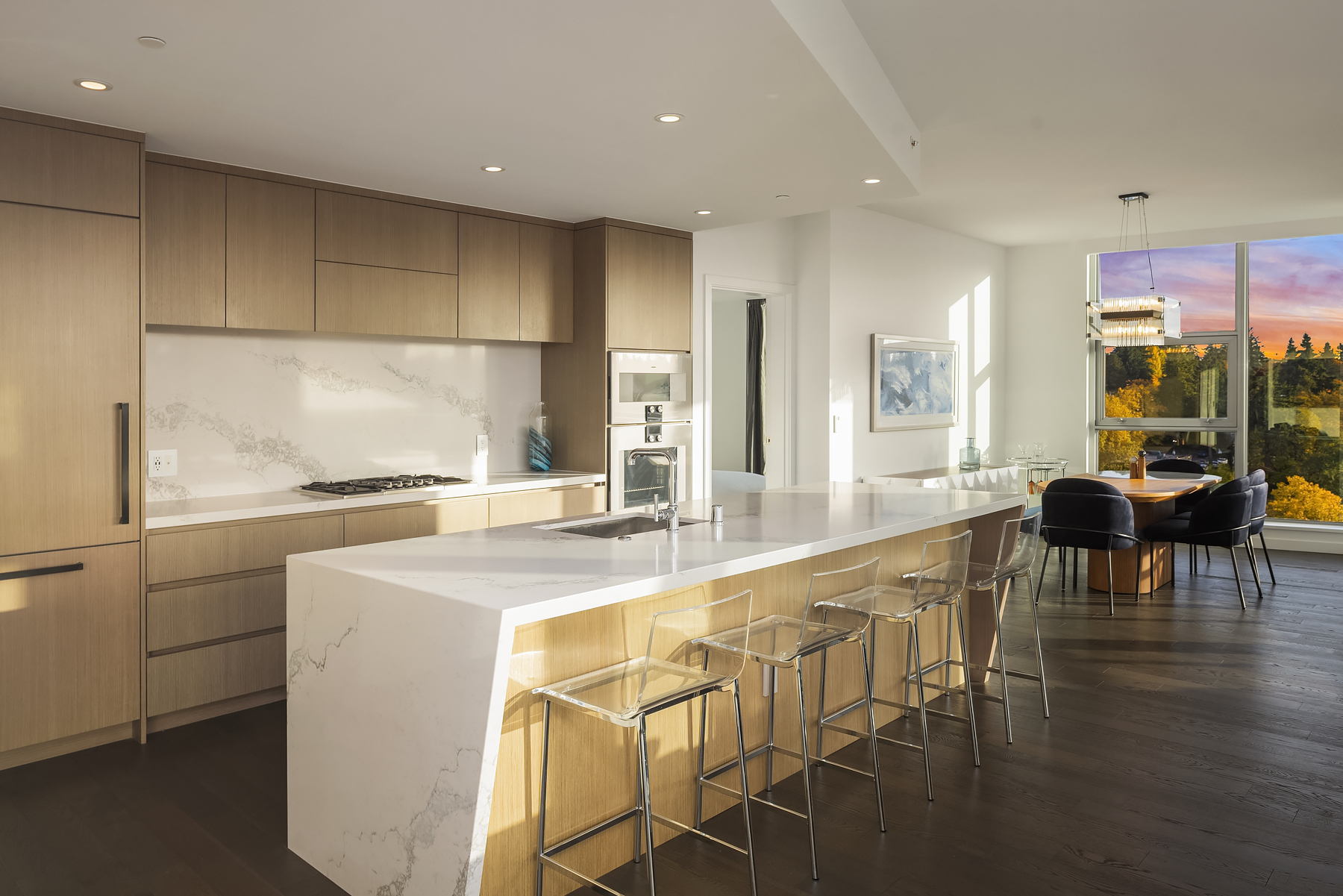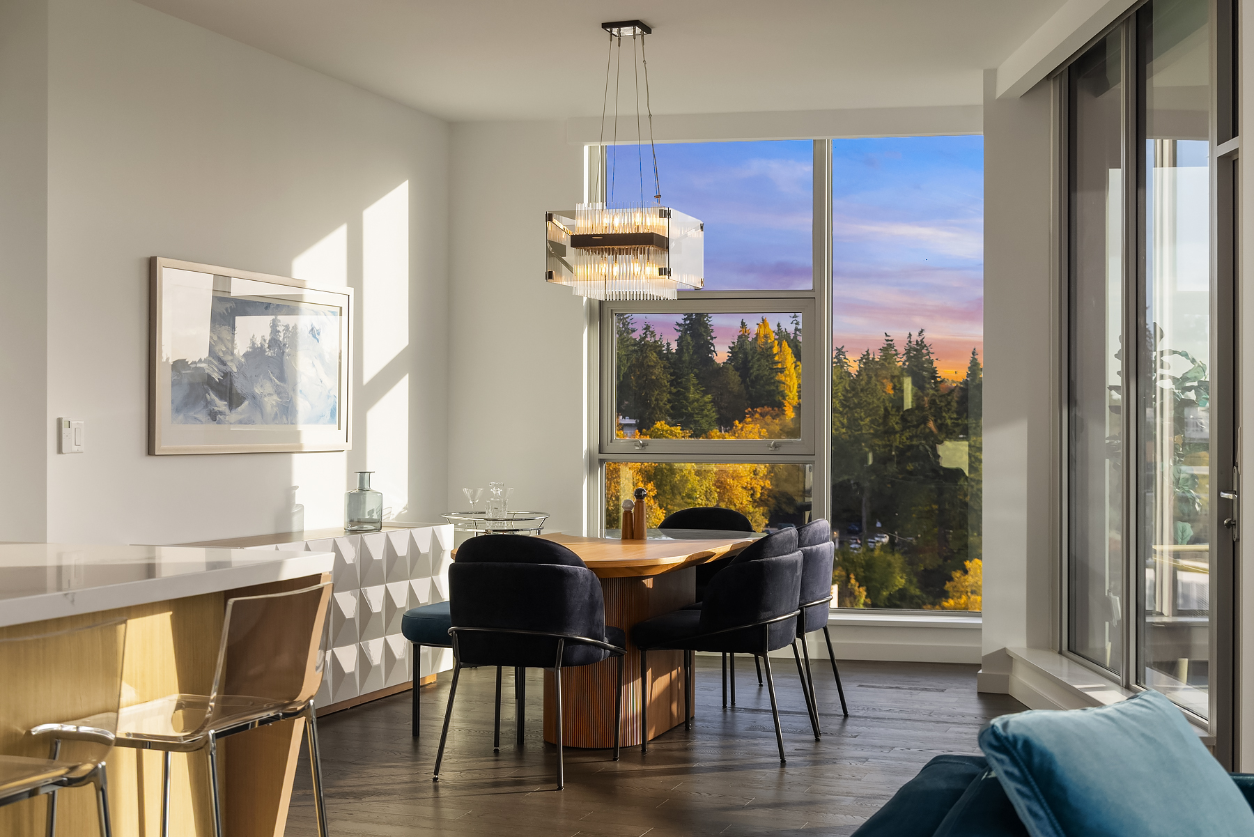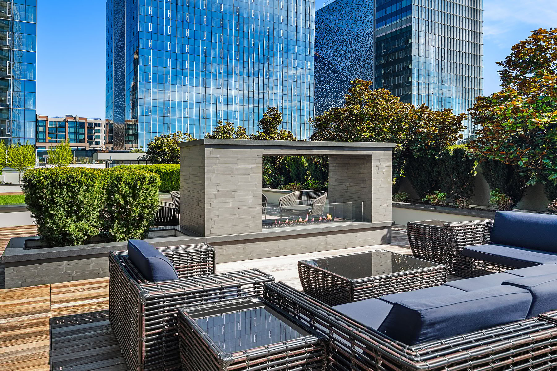 Boasting one of the most spectacular vantage points in the city, this SW corner unit dazzles with sweeping views from Downtown Bellevue Park & Meydenbauer Bay to Downtown Seattle, the Olympics & Mount Rainier! Drenched in natural light, the sprawling 1450sf floorplan is a coveted find with private foyer, split-bedroom layout & extended indoor/outdoor balcony. Sophisticated modern finishes & high-end upgrades throughout. Showcase kitchen with waterfall island & Gaggenau paneled appliances. Remote shades, 2 premium parking spots, EV charger & extra storage + Designer furnishings included. Glamorous high-rise amenities: 24-hour concierge, pool, spa, sauna, gym, virtual golf, owners lounge & garden terrace + luxury shops & fine dining at your door!