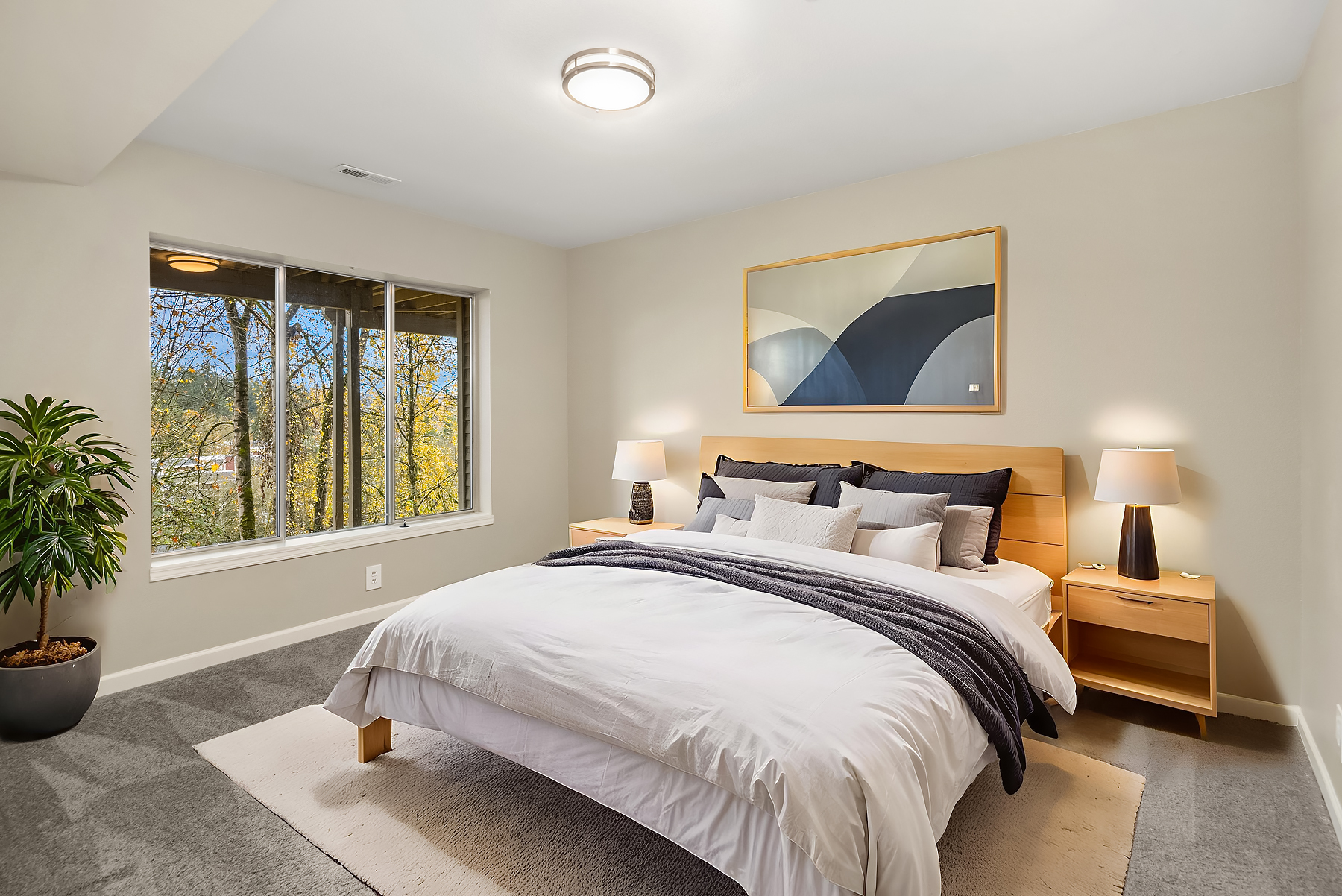 Perched atop a scenic greenbelt with sweeping territorial views amid the foliage, this turnkey contemporary stunner boasts dramatic architecture, modern luxury finishes & a sprawling 2,573sf floor plan! Desirably nestled in Marymoor Trails, between Grass Lawn Park & downtown Redmond, this unique 2-story townhome with full daylight basement is a rare & sought-after find. Impressive foyer with cascading open staircase. Grand living room with soaring windows & quartz gas fireplace opens to formal dining, massive kitchen & entertainment balcony. Lofted primary suite with vaulted ceilings & lavish bath. Lower level with 3rd bed, 3rd bath, 2nd laundry, kitchenette & huge family room with fireplace, oversized windows & private deck. 2-car garage, ample storage & central A/C!