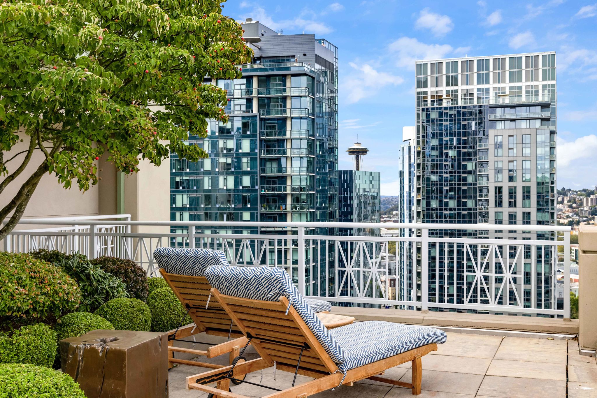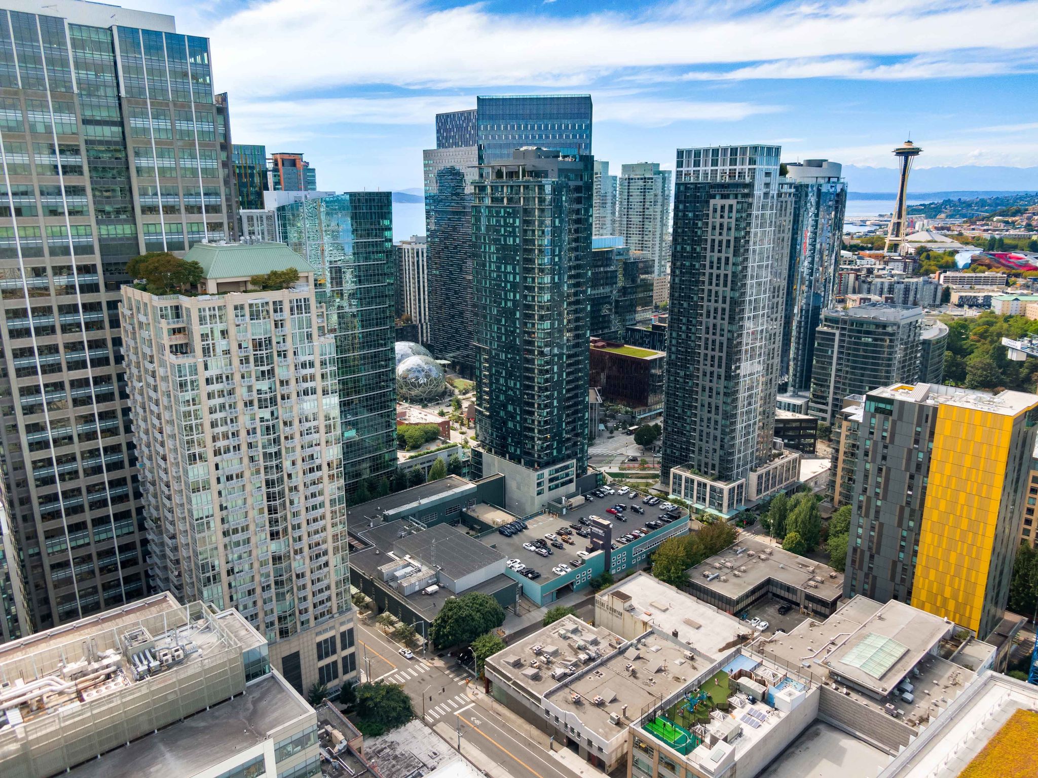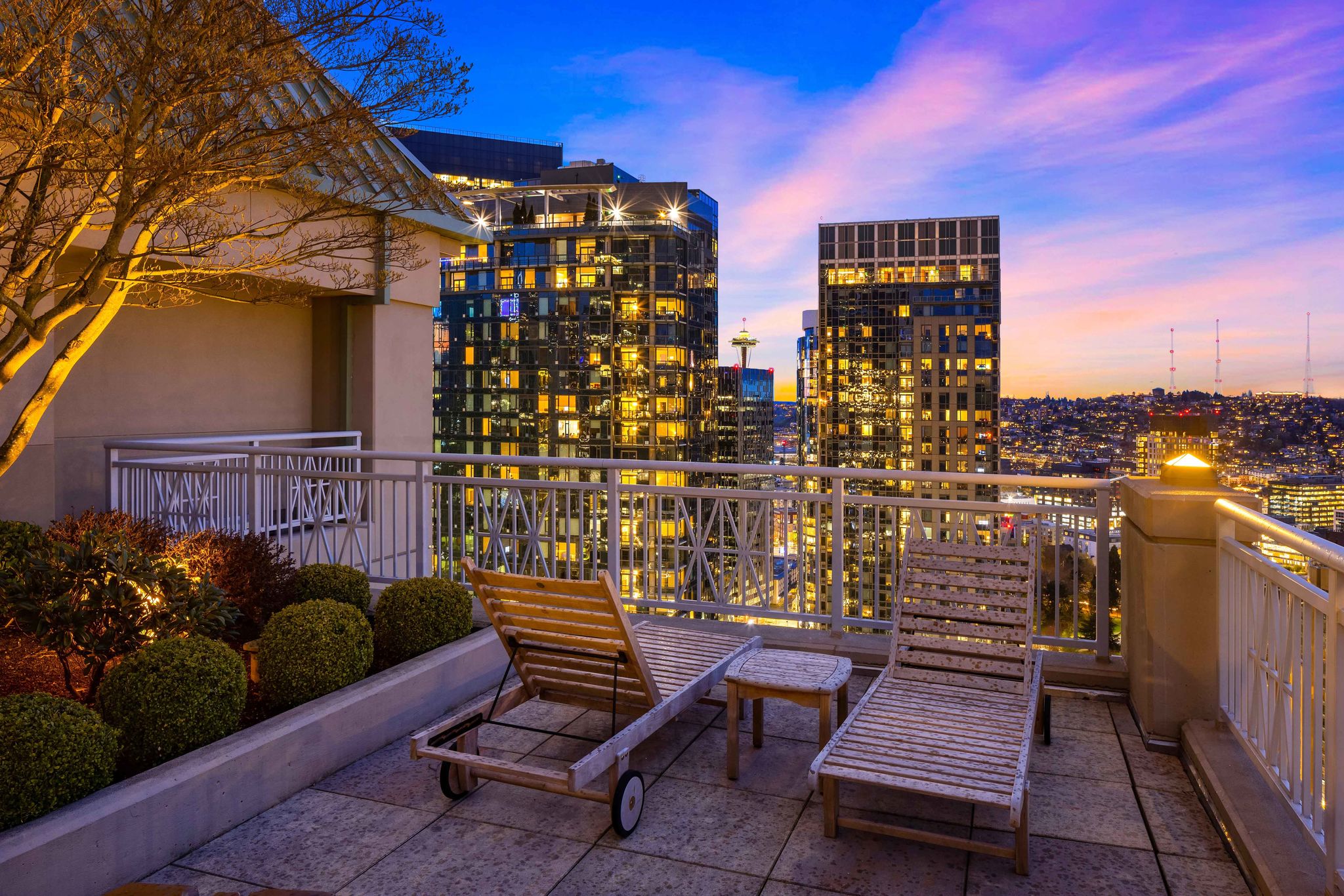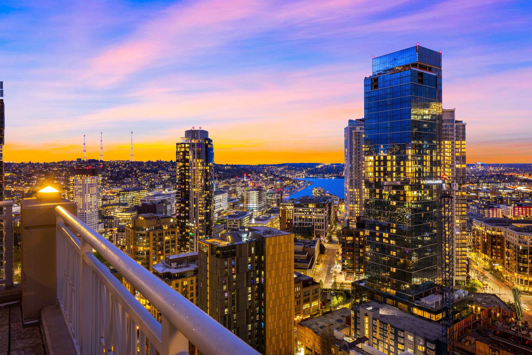 819 Virginia St #3101 Seattle, WA 98101 - Spectacularly perched way up on the 31st floor in Denny Triangle's glamorous Cosmopolitan with sprawling northwesterly views of Lake Union, Queen Anne hill, Olympic Mountains & glowing cityscapes, you'll be living it up in contemporary luxury in this elegantly upgraded 966sf masterpiece! An entertainers dream showcasing rich handscraped hardwoods, stunning walls of windows, grand living room with fireplace & modern kitchen with calacatta quartz counters, full height backsplash & gas stove. Glitzy foyer opens to den/office with built-in desk & shelving. Primary suite with romantic balcony & spacious walk-in closet with organizers. Indulging tiled bath with dual raised vessel sinks. Prime park spot & additional storage space. Highrise amenities: 24hr concierge, fitness center, spa/sauna, clubroom, lounge, rooftop garden, guest suite, business center & more!