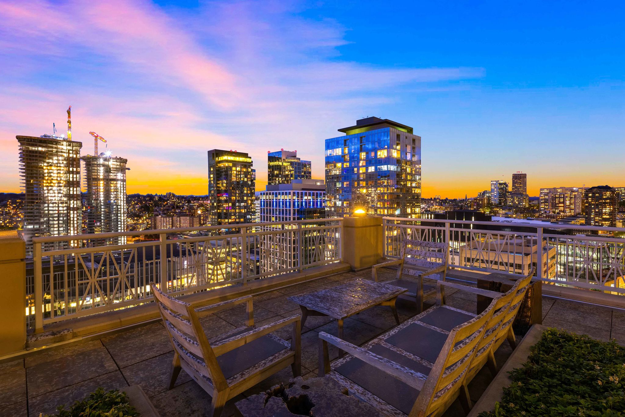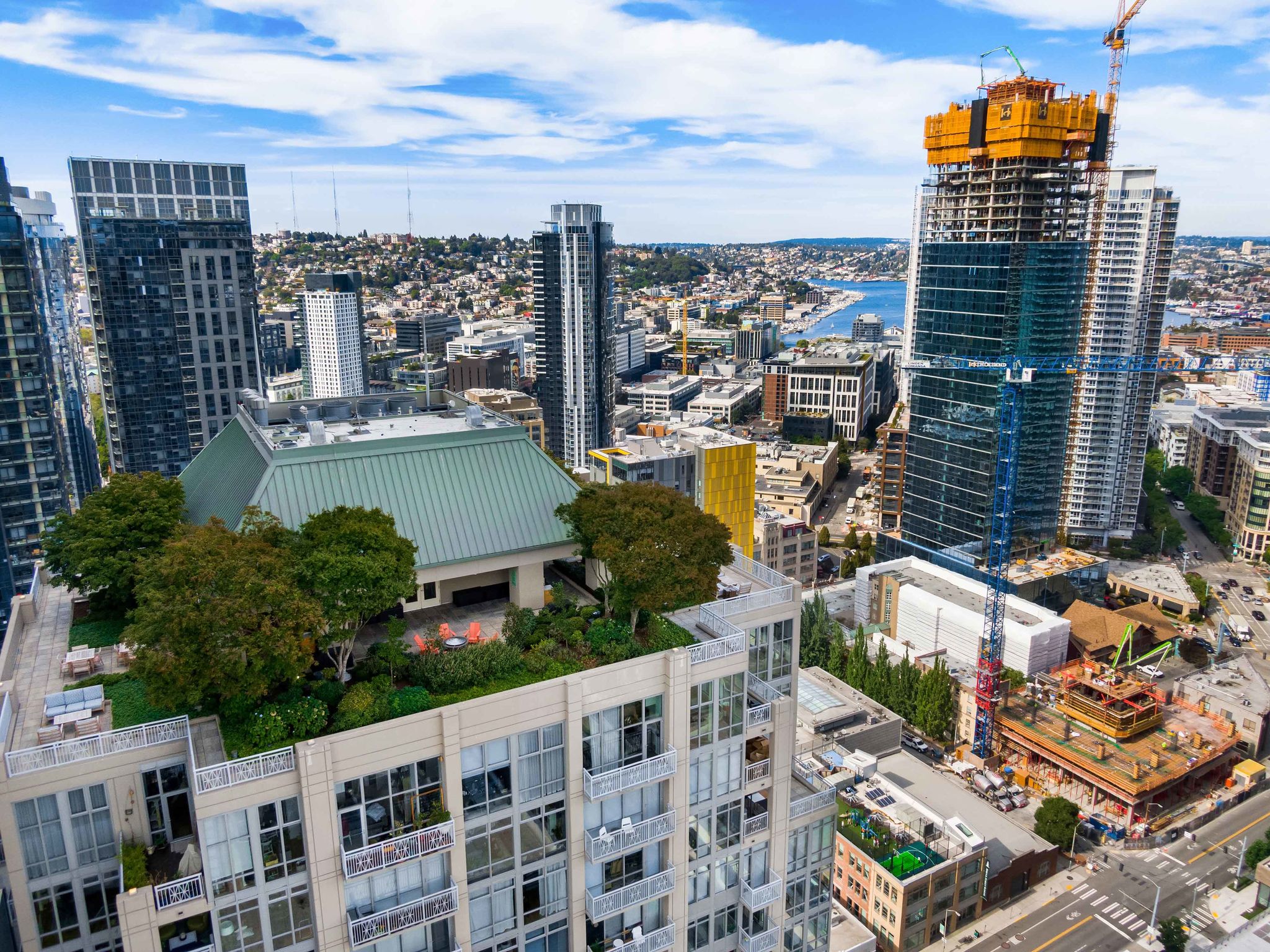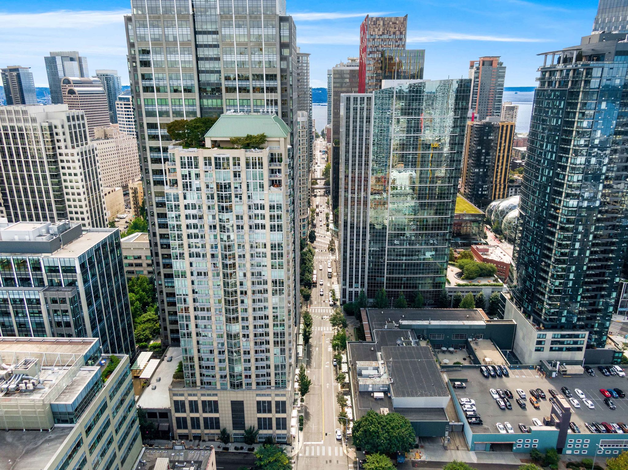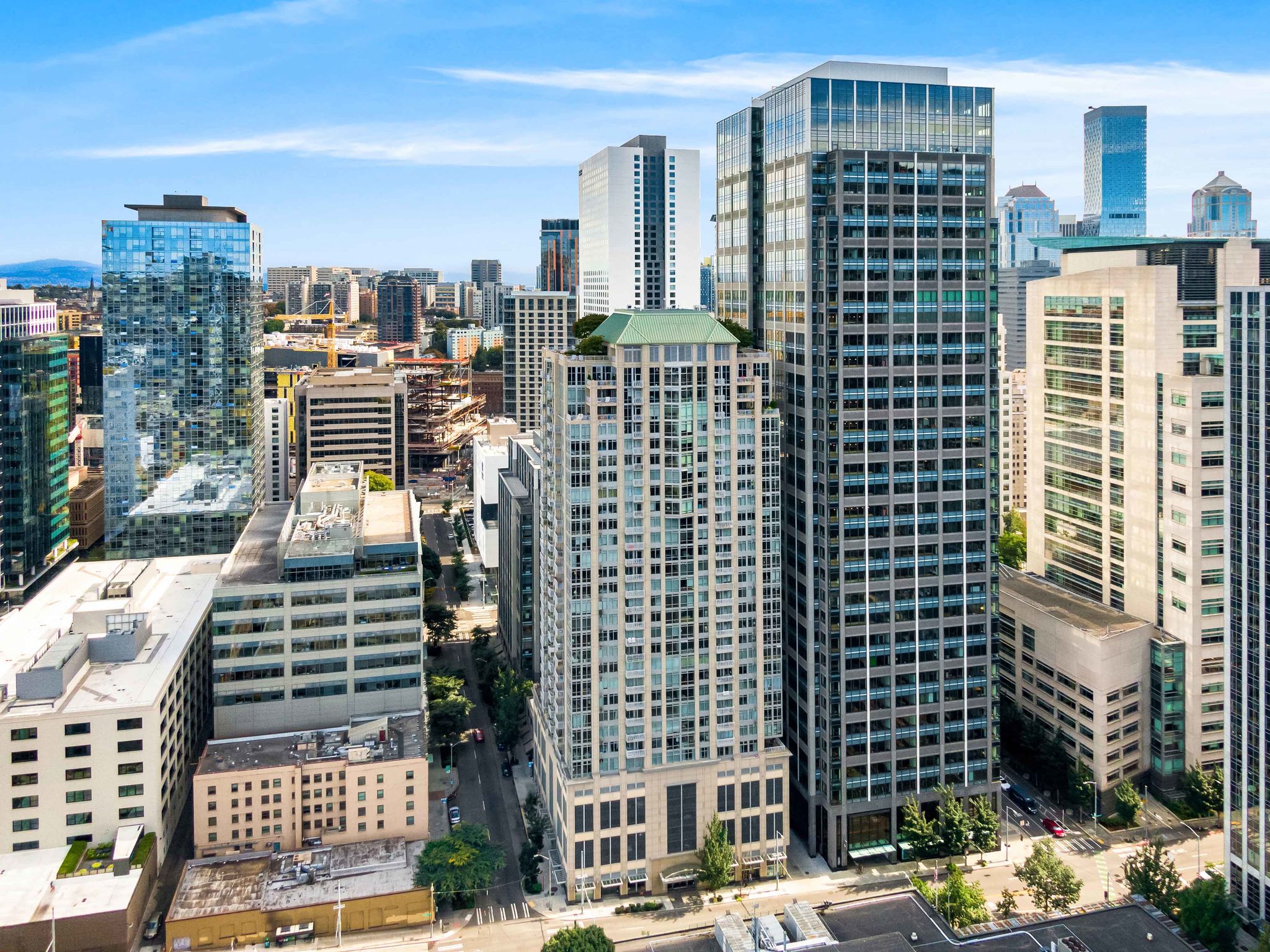 819 Virginia St #3101 Seattle, WA 98101 - Spectacularly perched way up on the 31st floor in Denny Triangle's glamorous Cosmopolitan with sprawling northwesterly views of Lake Union, Queen Anne hill, Olympic Mountains & glowing cityscapes, you'll be living it up in contemporary luxury in this elegantly upgraded 966sf masterpiece! An entertainers dream showcasing rich handscraped hardwoods, stunning walls of windows, grand living room with fireplace & modern kitchen with calacatta quartz counters, full height backsplash & gas stove. Glitzy foyer opens to den/office with built-in desk & shelving. Primary suite with romantic balcony & spacious walk-in closet with organizers. Indulging tiled bath with dual raised vessel sinks. Prime park spot & additional storage space. Highrise amenities: 24hr concierge, fitness center, spa/sauna, clubroom, lounge, rooftop garden, guest suite, business center & more!