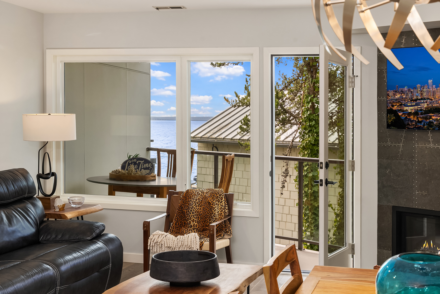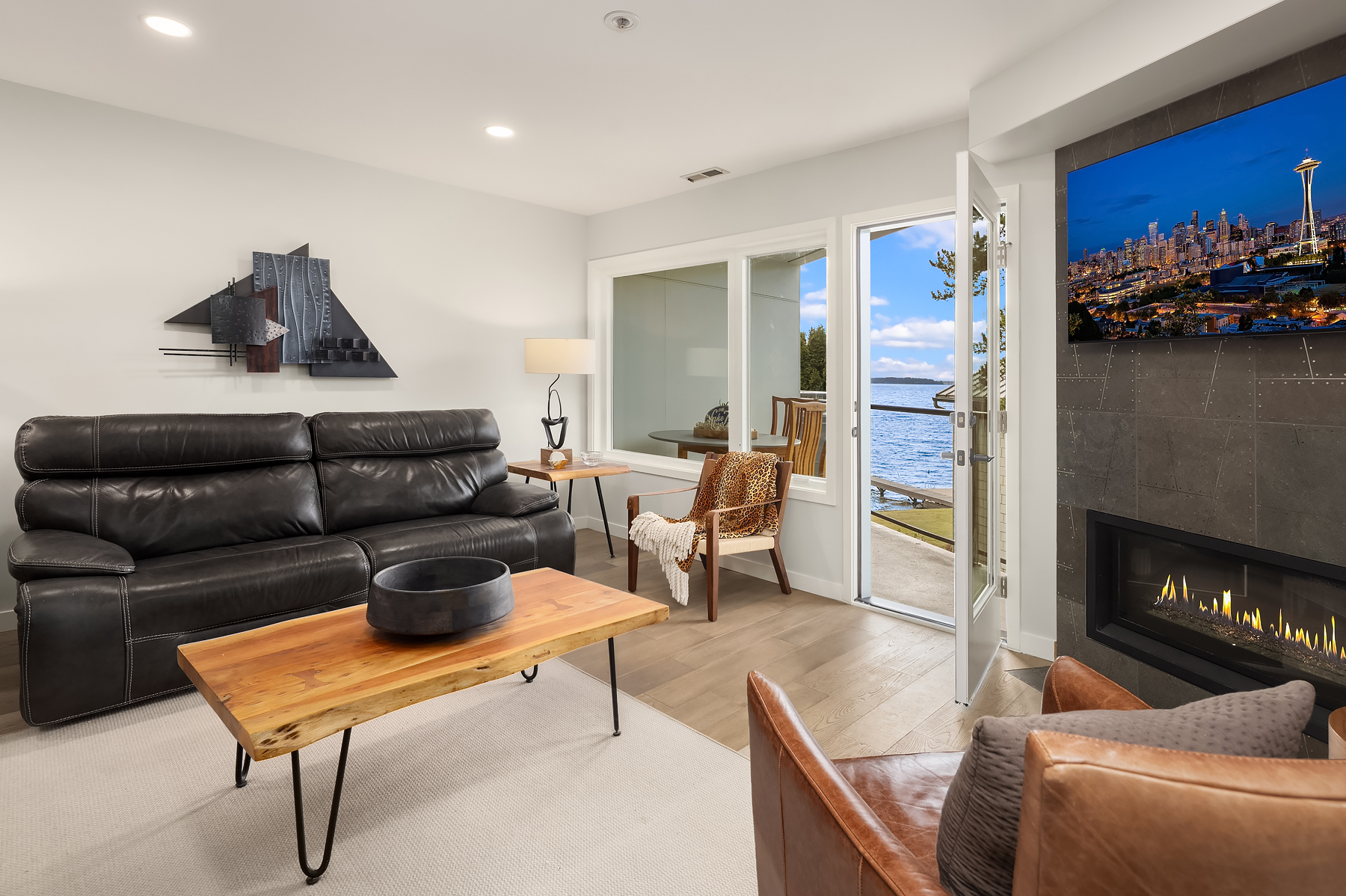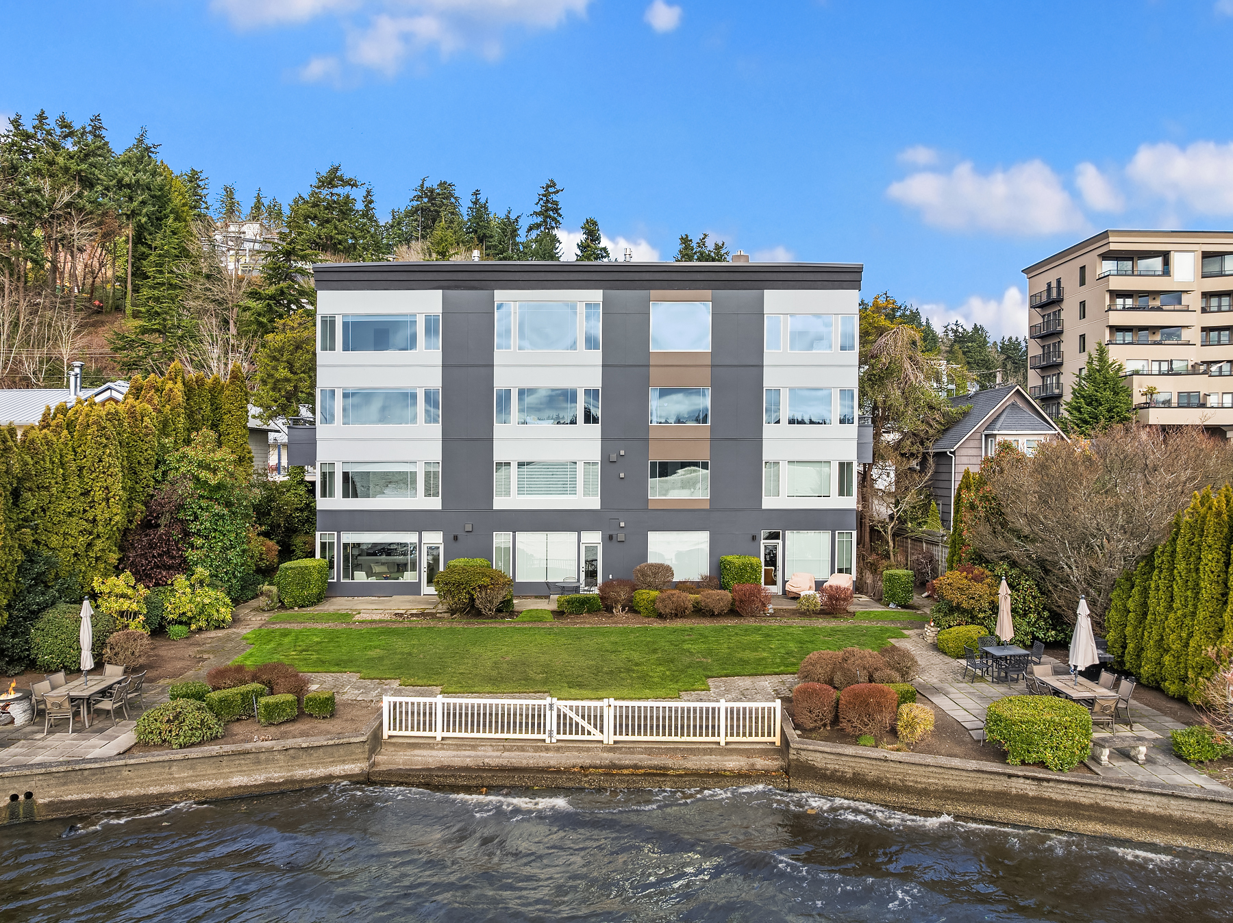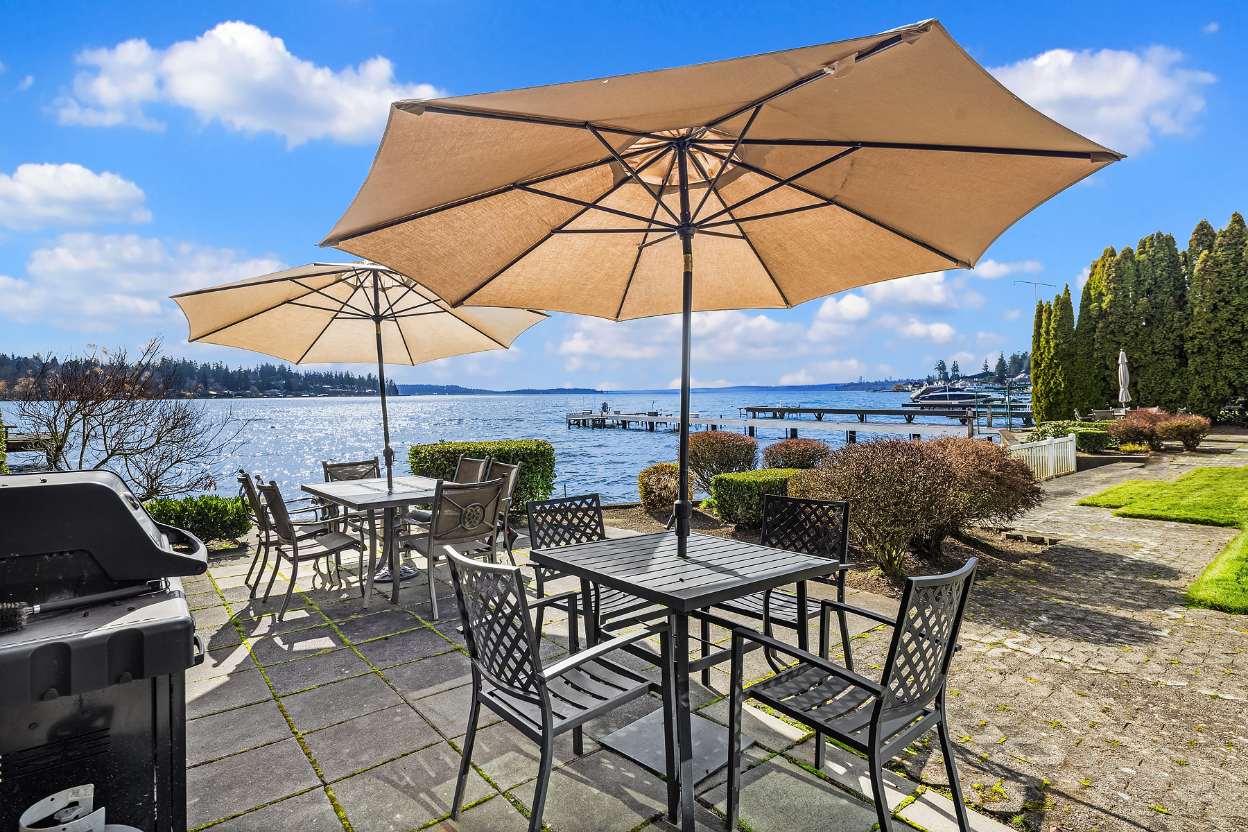 LAKE VIEW WATERFRONT RETREAT ~ Scenically poised on the shores of Juanita Bay in Kirkland's newly updated Rose Pointe Condos, this contemporary oasis dazzles with stunning new high-end modern finishes, open concept bi-level layout & tranquil lakeside views! Turnkey move-in ready luxury featuring over $150k+ in quality upgrades - Pella windows, lavish tiled baths, wide-plank hardwoods, upscale millwork, artisan hardware, custom lighting, designer paint, solid core doors & so much more. Showcase kitchen with Calacatta quartz counters, bold full-height tile backsplash, gas cooktop & premium appliances opens to spacious living & dining room with floor-to-ceiling linear gas fireplace & wall-to-wall windows overlooking covered view balcony. Primary suite features breathtaking spa-inspired 5-piece bath with heated tile floors & romantic lanai. Sprawling private beachfront with outdoor lounge & water sport storage. A quaint 15-unit gated building with secure parking garage, elevator & bonus storage room. Dream location with 22-acre Juanita Beach Waterfront Park at your doorstep & vibrant downtown Kirkland just moments away!