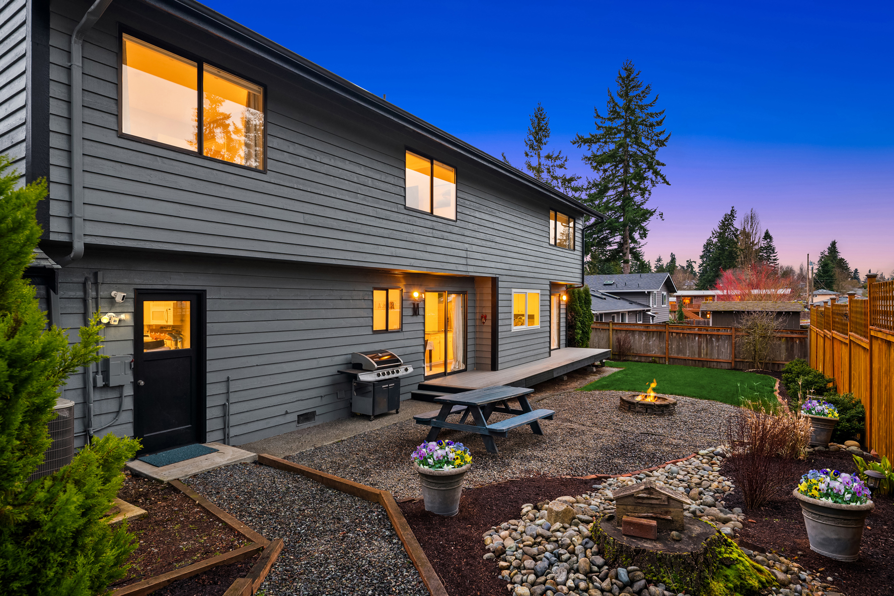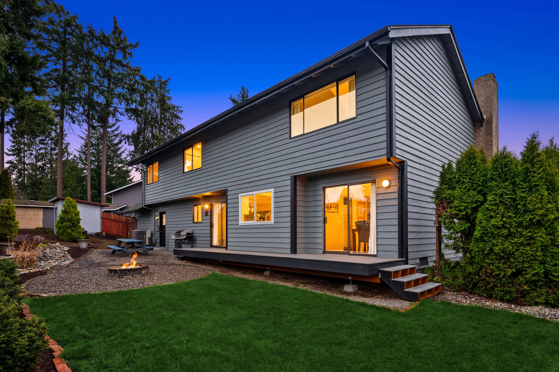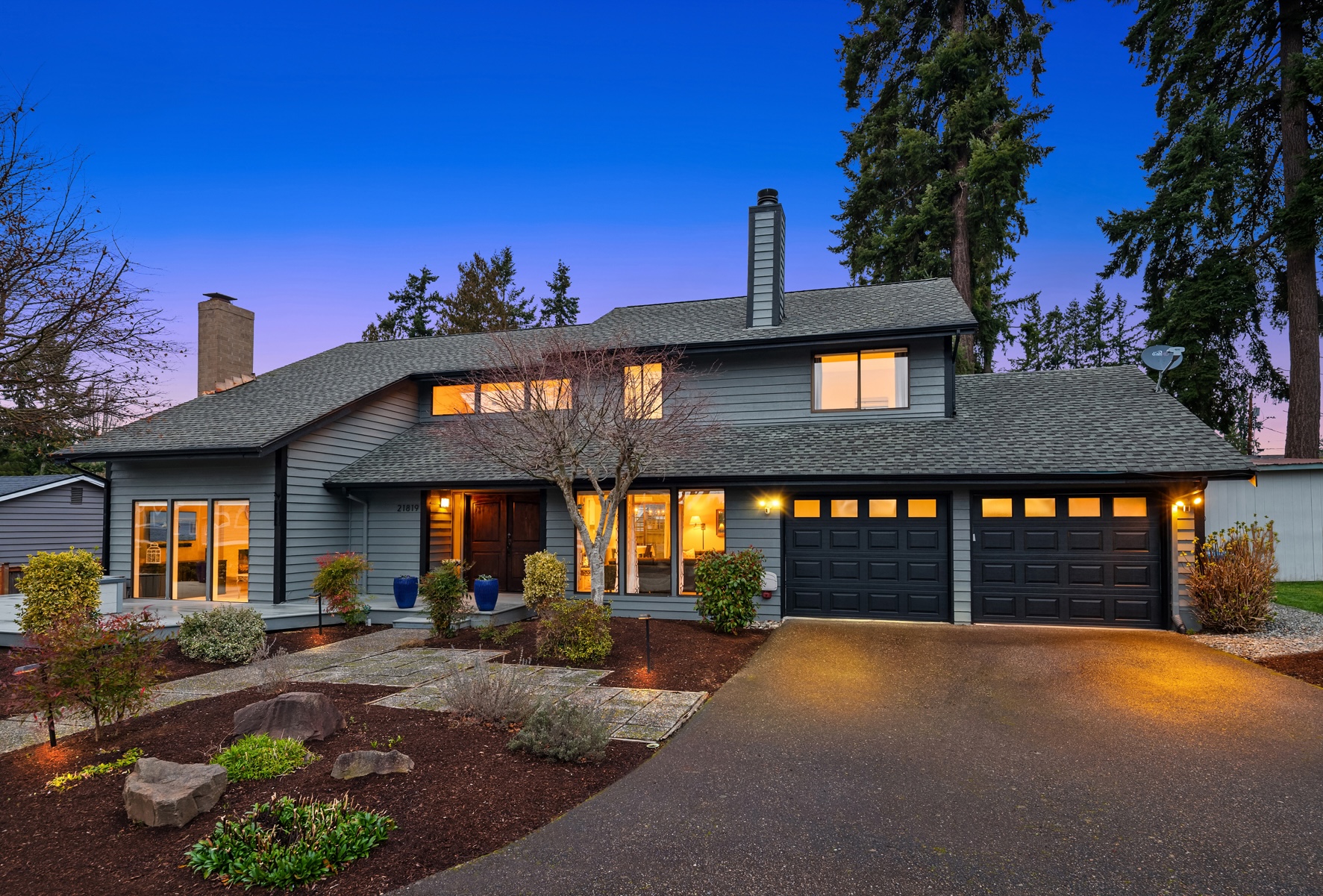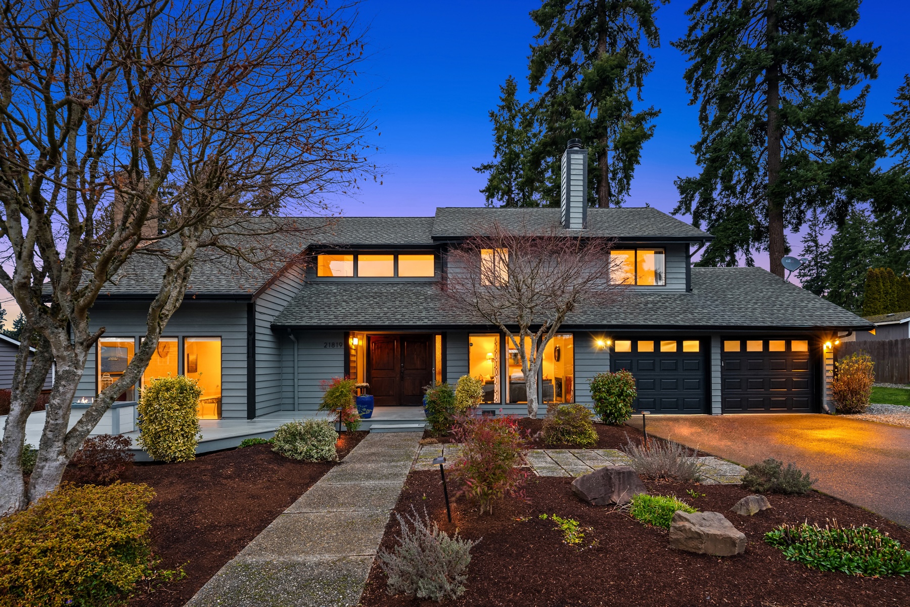 Tucked away on a coveted cul-de-sac in Edmonds esteemed Esperance neighborhood, this contemporary stunner dazzles with dramatic architecture, upscale finishes & captivating curb appeal! Manicured grounds, sprawling wrap-around front porch & covered entry lead to impressive double-door foyer with solid oak hardwoods, soaring ceilings & modern cable-rail staircase with open loft. Brilliantly designed, the 2,420sf, 4 bed, 2.5 bath floor plan features spacious rooms, oversized windows & abundant natural light. Living room with vaulted open-beam ceiling, towering brick fireplace with floating hearth & floor-to-ceiling windows opens to formal dining with glass slider to new deck. Upgraded chef's kitchen with granite counters, cooktop island, double ovens & dining nook with 2nd slider opens to huge family room with fireplace & wall-to-wall windows. Grand primary suite with cathedral ceilings, designer bath with dual-sink marble vanity & pocket-door to walk-in closet. Laundry room with deep stainless steel utility sink. Massive garage with custom cabinetry & new doors with privacy glass accents. Beautifully landscaped backyard with fire pit & storage shed. New high-efficiency furnace, central A/C & more. Short walk to prized schools with rapid access to major highways, medical facilities & downtown Edmonds waterfront!
