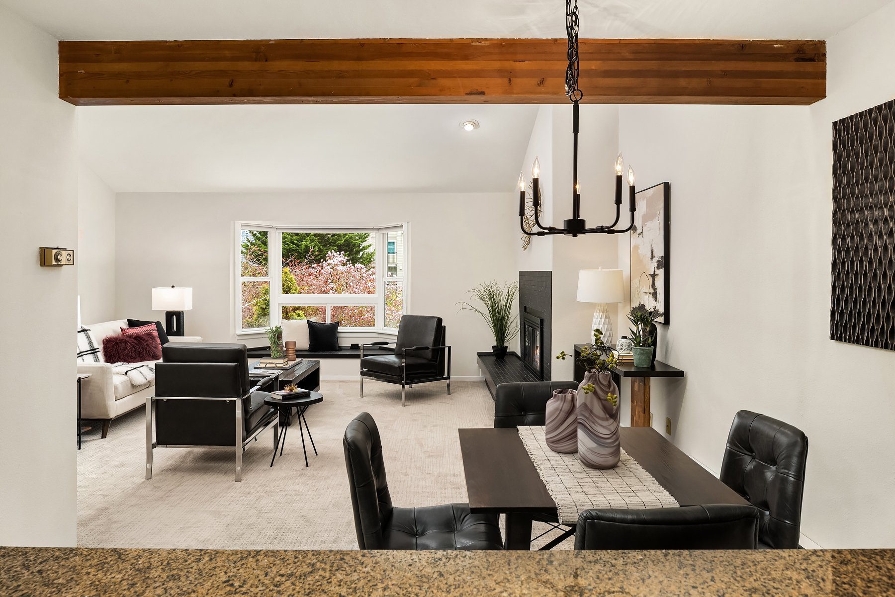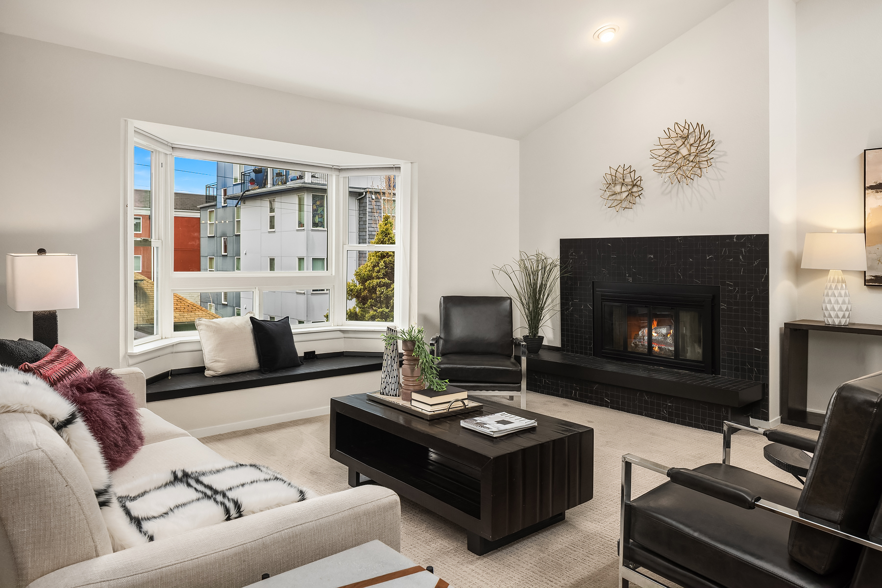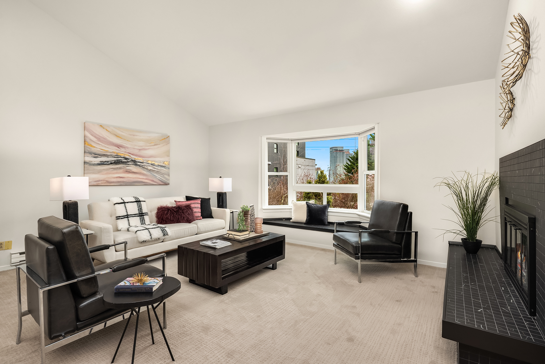 Dazzling Capitol Hill Stunner ~ Just steps from Broadway, this top-floor designer jewel box in sought-after Versailles is where vibrant urban living meets modern sophisticated style. Perched above the city in a quaint 21-unit enclave with secure garage & elevator, you'll fall in love with the expansive light-filled open floor plan, dramatic soaring vaulted ceilings, panoramic clerestory windows & sparkling downtown skyline views. Move-in ready & loaded with new upgrades: rich LVP floors, gorgeous pattern carpet, luxurious high-end tile, upscale curated lighting + white millwork, black hardware, fresh paint, new A/C & more. Covered outdoor entry overlooking wooded courtyard opens to welcoming private foyer. Spacious kitchen with solid oak painted cabinets, stainless steel appliances & slab granite counters opens to dining space & huge living room with tiled fireplace, sweeping hearth, bay window with bench seating & retro wet bar alcove. Opulent hall bath with oversized soaking tub, big skylight & bold tile surround. Vaulted ceilings carry through to the primary suite with tall windows, walk-in closet, rare granite vanity & custom tile shower. Guest bedroom/office + full-size laundry & extra storage locker. Enjoy the epicenter of Seattle culture with shops, dining, nightlife & light rail at your door!