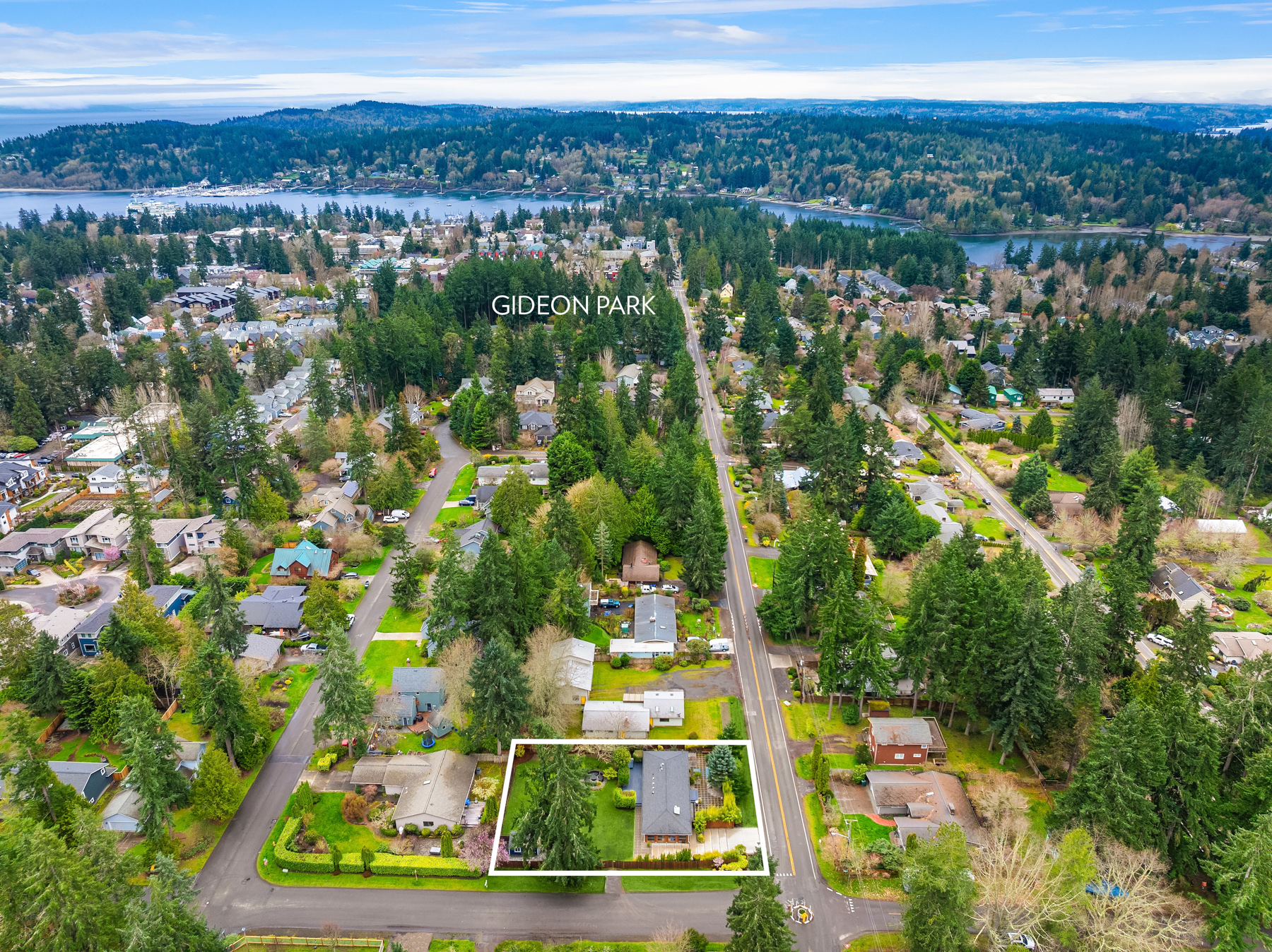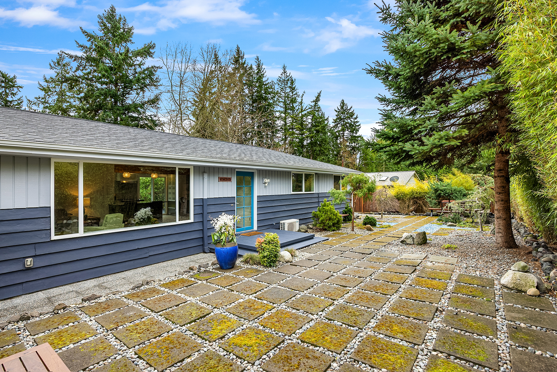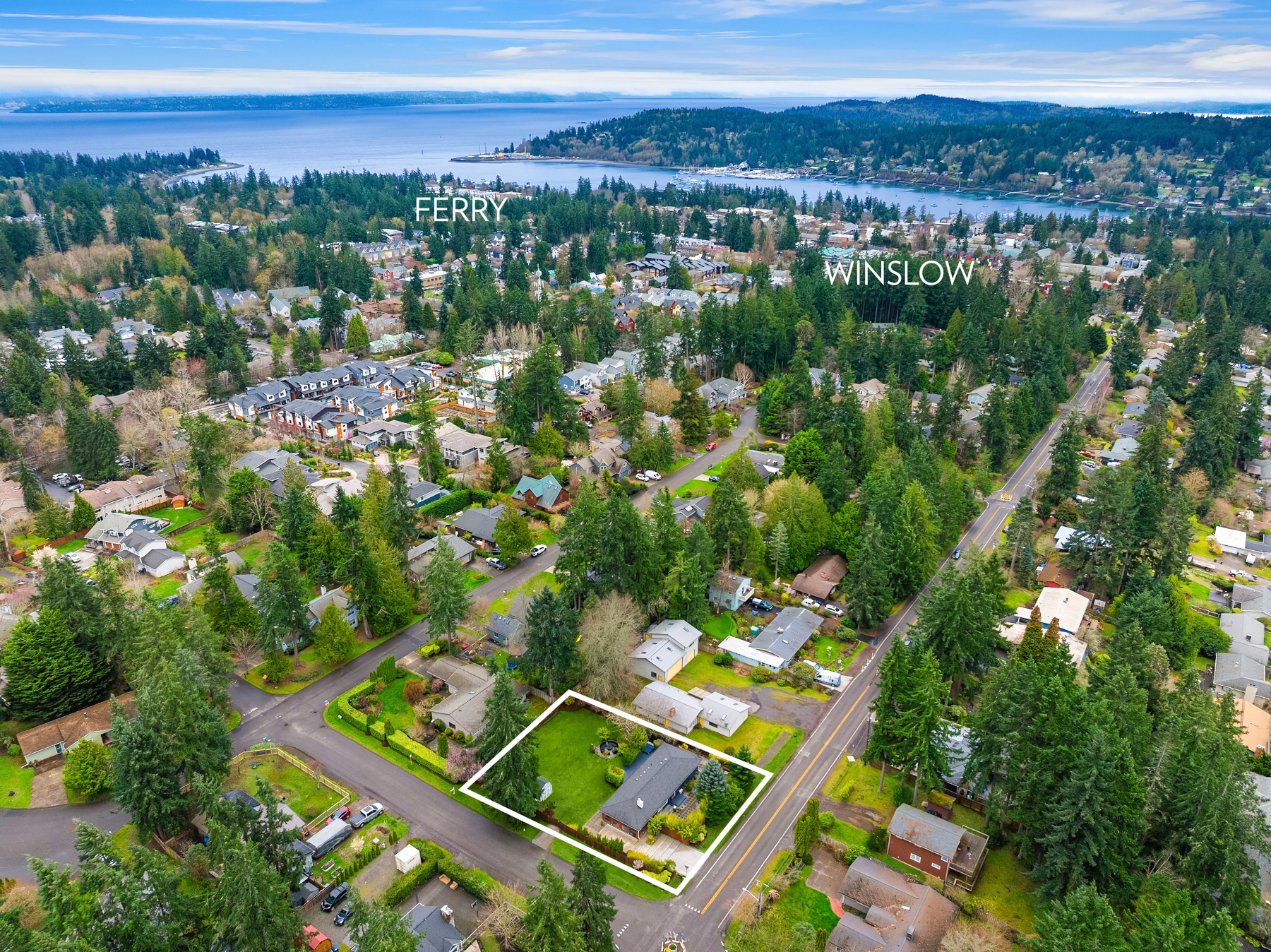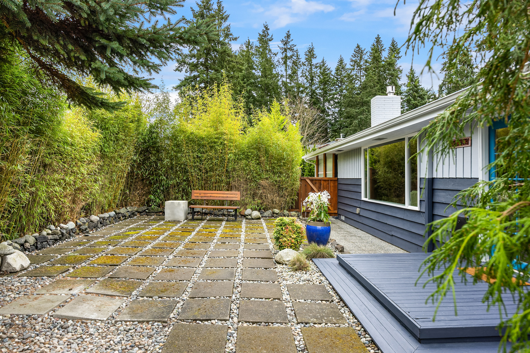 Conveniently nestled on a sprawling .31 acre level corner lot just moments to historic downtown Winslow, Seattle ferries & prized Bainbridge Island schools, this turnkey zen-inspired mid-century rambler is an aesthetic fusion of modern minimalistic design with a touch of industrial flair on an ornamental, tree-lined outdoor living oasis. A fully fenced-in fortress, the gated driveway opens to a peaceful bonsai garden with extended paver patio, custom benches & french door foyer. The spacious light-filled living room with oversized picture window, stunning tiled gas fireplace, recessed fixtures & newly refinished solid-oak hardwoods opens to bold granite kitchen with peninsula bar, waterfall edging, soaring glass tile backsplash, stainless steel cabinets, glass slider & custom caster table that extends the counter space. Tile floors & reclaimed wood doors open to showcase den with sliding glass wall, laundry nook & 1/2 bath with vessel sink, wall mount faucet & epoxy-filled wood slab counter. Easy living 1,272sf layout with fresh paint, white millwork, ductless A/C & upgraded hall bath with floating vanity. Hardwoods flow into guest bedrooms & primary suite with slider to sweeping deck & secluded hot tub. Glass paneled covered lanai (converted carport) with commercial gym matting. Massive backyard with furnished gas fire pit, organic garden beds, shop, storage shed, side road access & DADU upside potential!