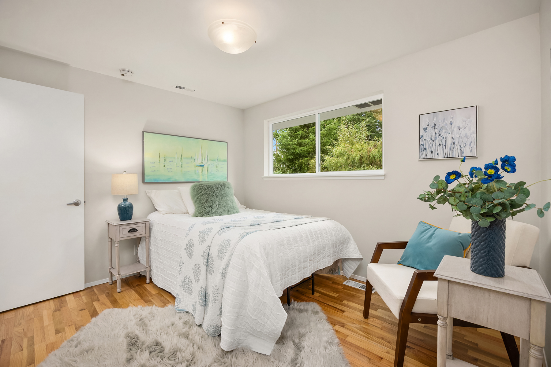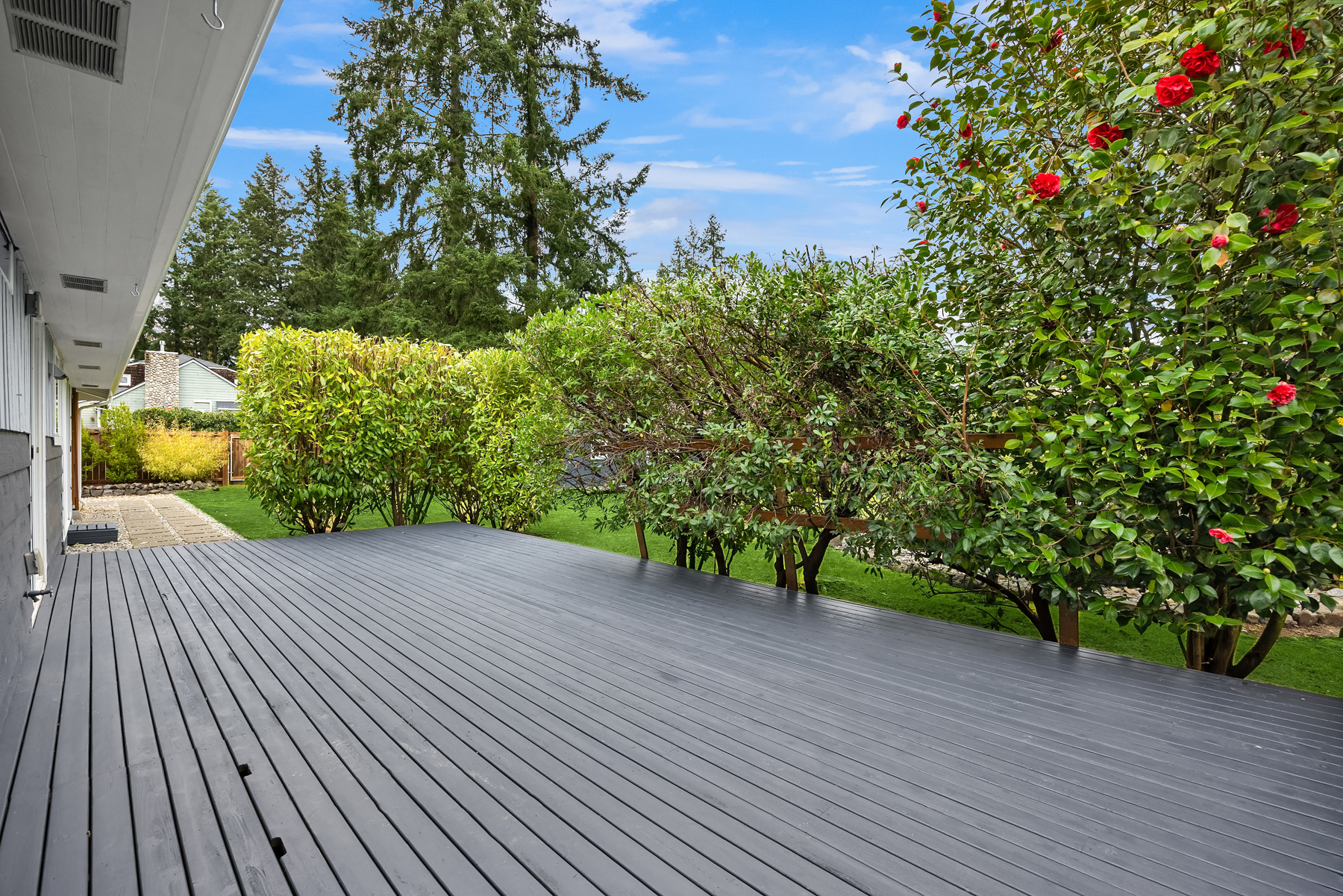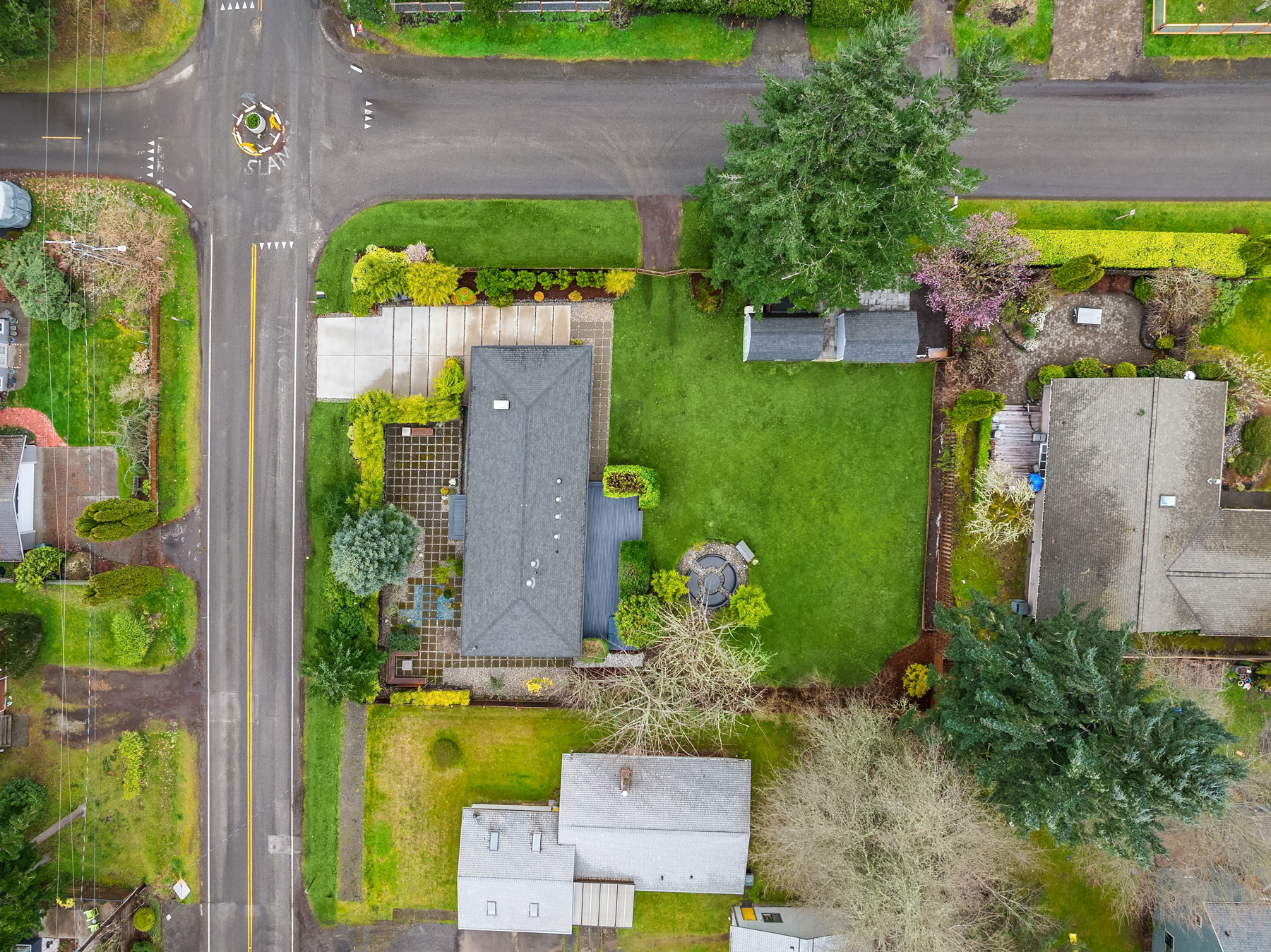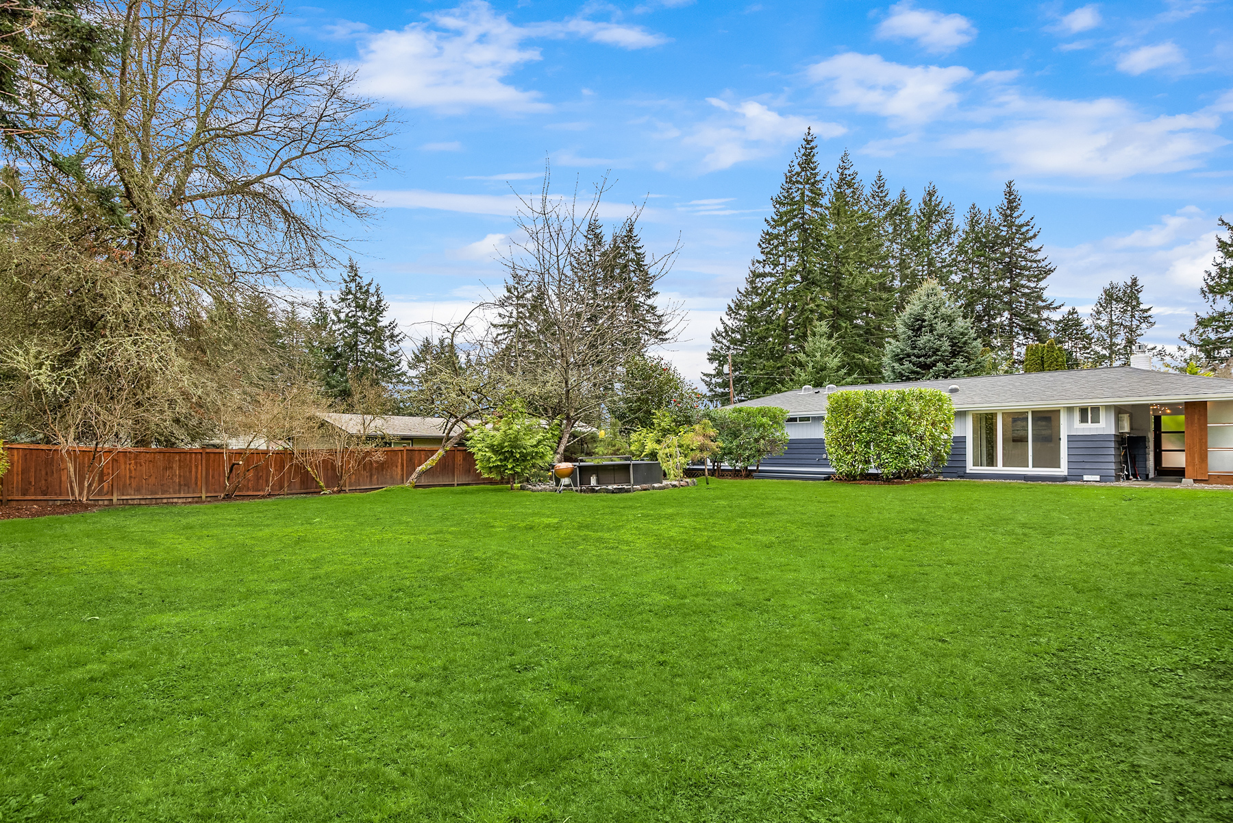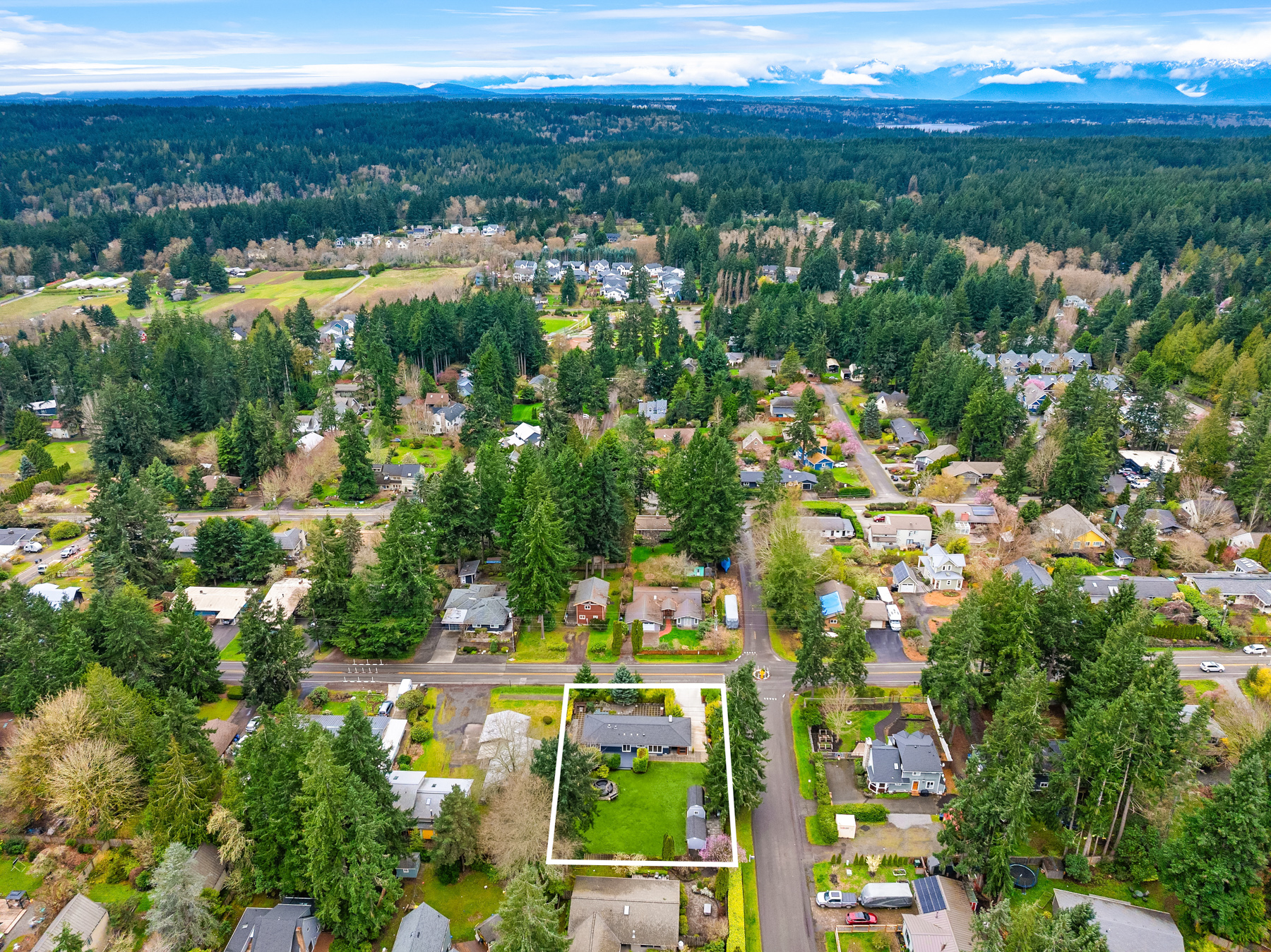 Conveniently nestled on a sprawling .31 acre level corner lot just moments to historic downtown Winslow, Seattle ferries & prized Bainbridge Island schools, this turnkey zen-inspired mid-century rambler is an aesthetic fusion of modern minimalistic design with a touch of industrial flair on an ornamental, tree-lined outdoor living oasis. A fully fenced-in fortress, the gated driveway opens to a peaceful bonsai garden with extended paver patio, custom benches & french door foyer. The spacious light-filled living room with oversized picture window, stunning tiled gas fireplace, recessed fixtures & newly refinished solid-oak hardwoods opens to bold granite kitchen with peninsula bar, waterfall edging, soaring glass tile backsplash, stainless steel cabinets, glass slider & custom caster table that extends the counter space. Tile floors & reclaimed wood doors open to showcase den with sliding glass wall, laundry nook & 1/2 bath with vessel sink, wall mount faucet & epoxy-filled wood slab counter. Easy living 1,272sf layout with fresh paint, white millwork, ductless A/C & upgraded hall bath with floating vanity. Hardwoods flow into guest bedrooms & primary suite with slider to sweeping deck & secluded hot tub. Glass paneled covered lanai (converted carport) with commercial gym matting. Massive backyard with furnished gas fire pit, organic garden beds, shop, storage shed, side road access & DADU upside potential!