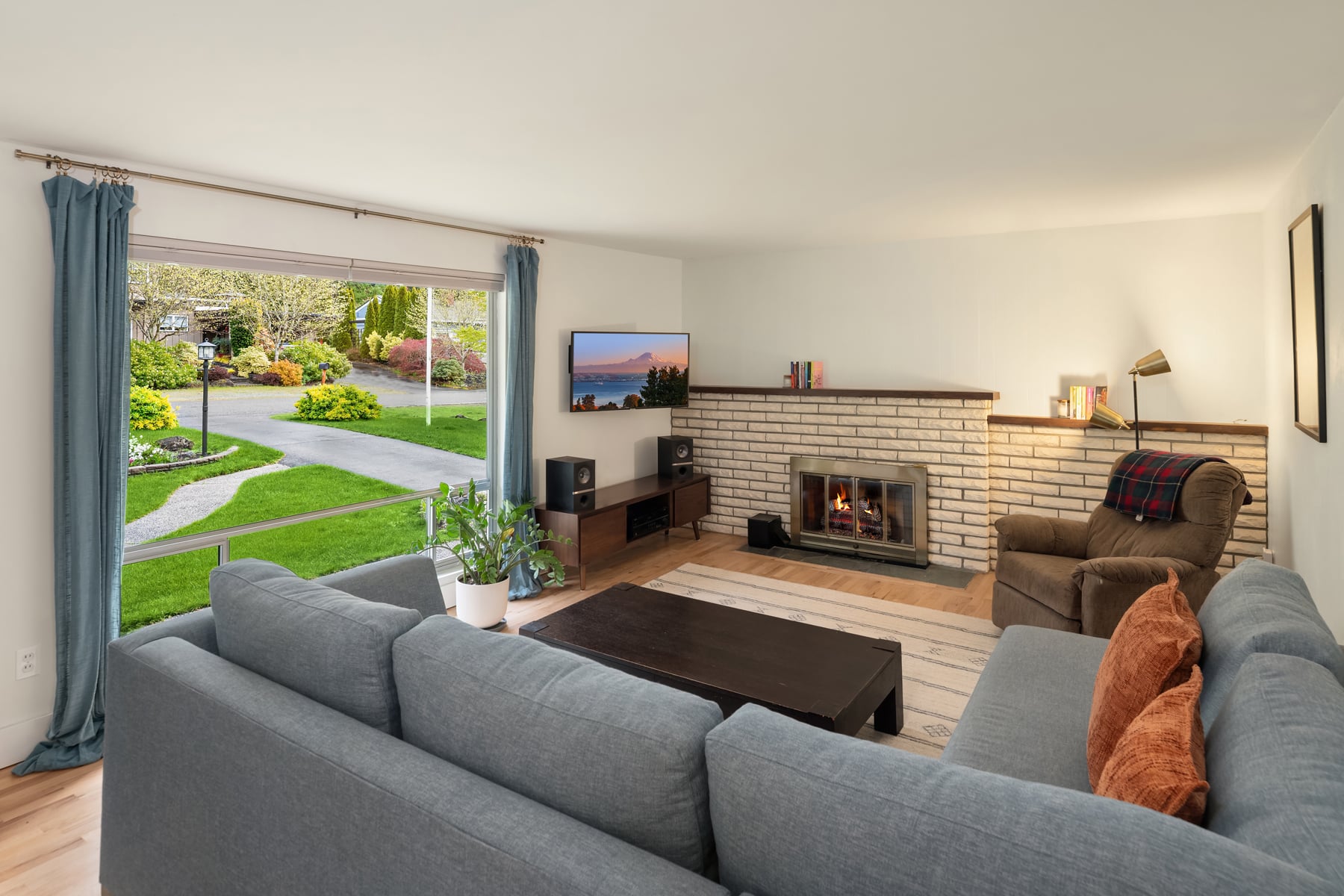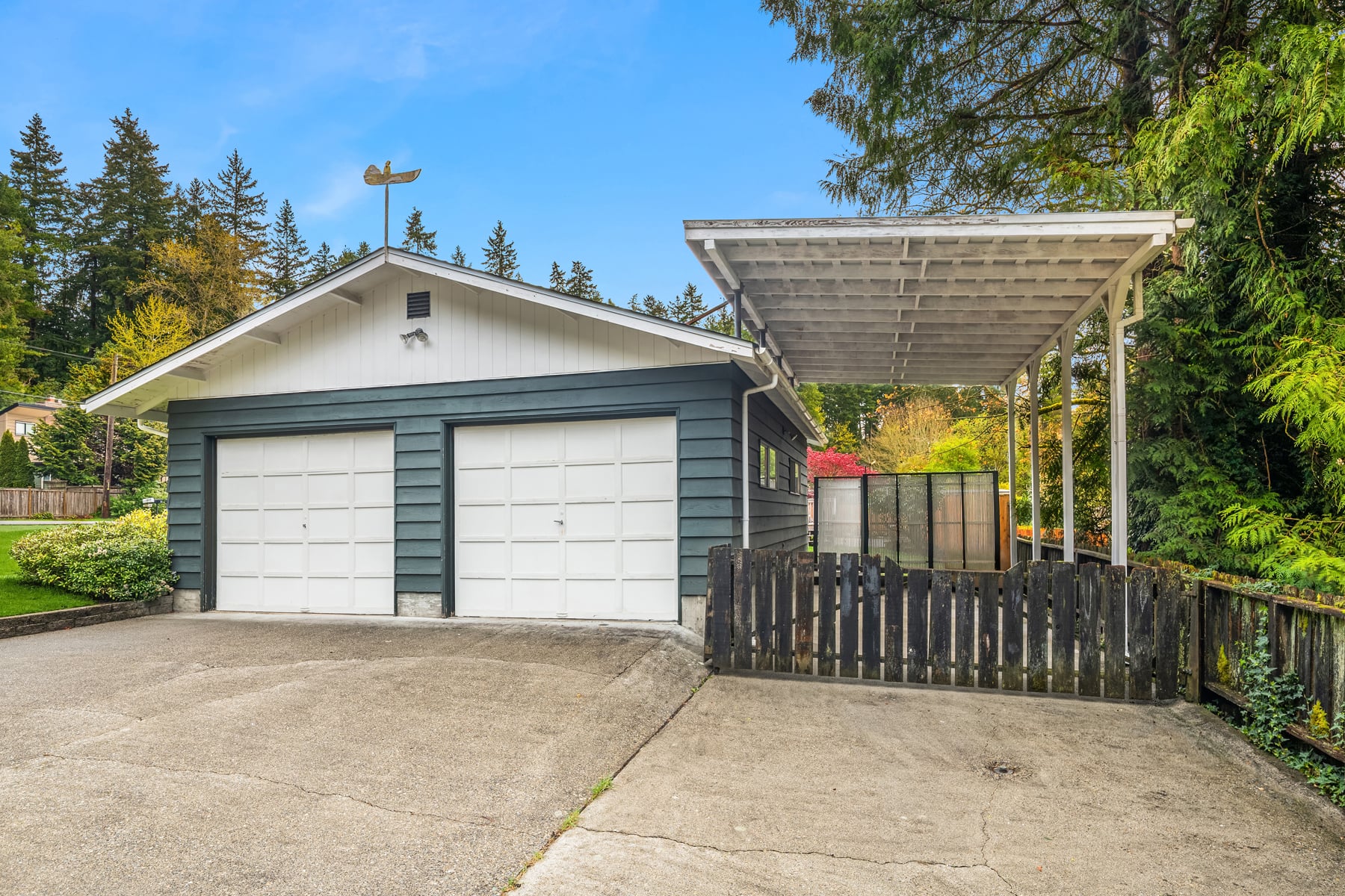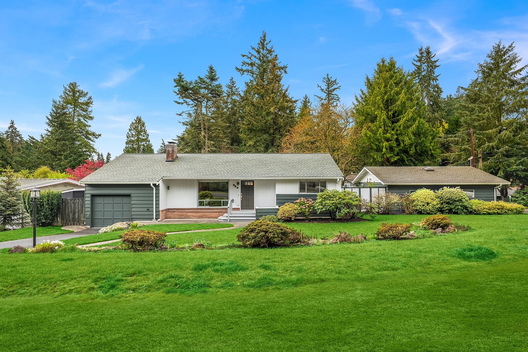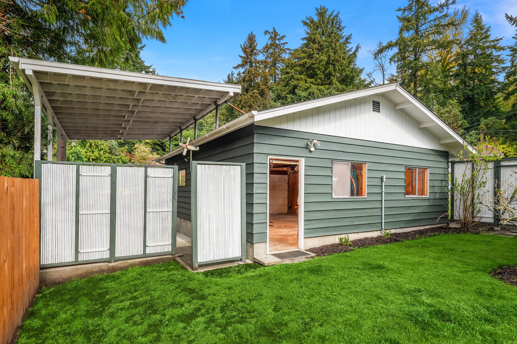Quietly tucked away on a sprawling corner lot in Richmond Highlands, this move-in ready mid-century rambler boasts a massive 590sf detached garage + towering RV carport with utility hookups! Striking vintage curb appeal with two-tone designer paint, roman brick planter & raised front porch. Newly refinished light oak hardwoods, upscale millwork with 6" baseboards & fresh paint throughout. Slate foyer opens to spacious living room with huge picture window & impressive wall-to-wall brick fireplace. Spacious formal dining with stunning floor-to-ceiling windows. Custom kitchen with sleek euro cabinets, crown molding & breakfast nook with slider to sweeping entertainment deck. Two generous bedrooms with corner windows on main floor + upper 3rd bedroom/bonus room with open rail staircase. Private backyard with extended patio, mature gardens & potting shed. New high-efficiency furnace with heat pump & central A/C. This lovingly cared for gem is a very special find!
