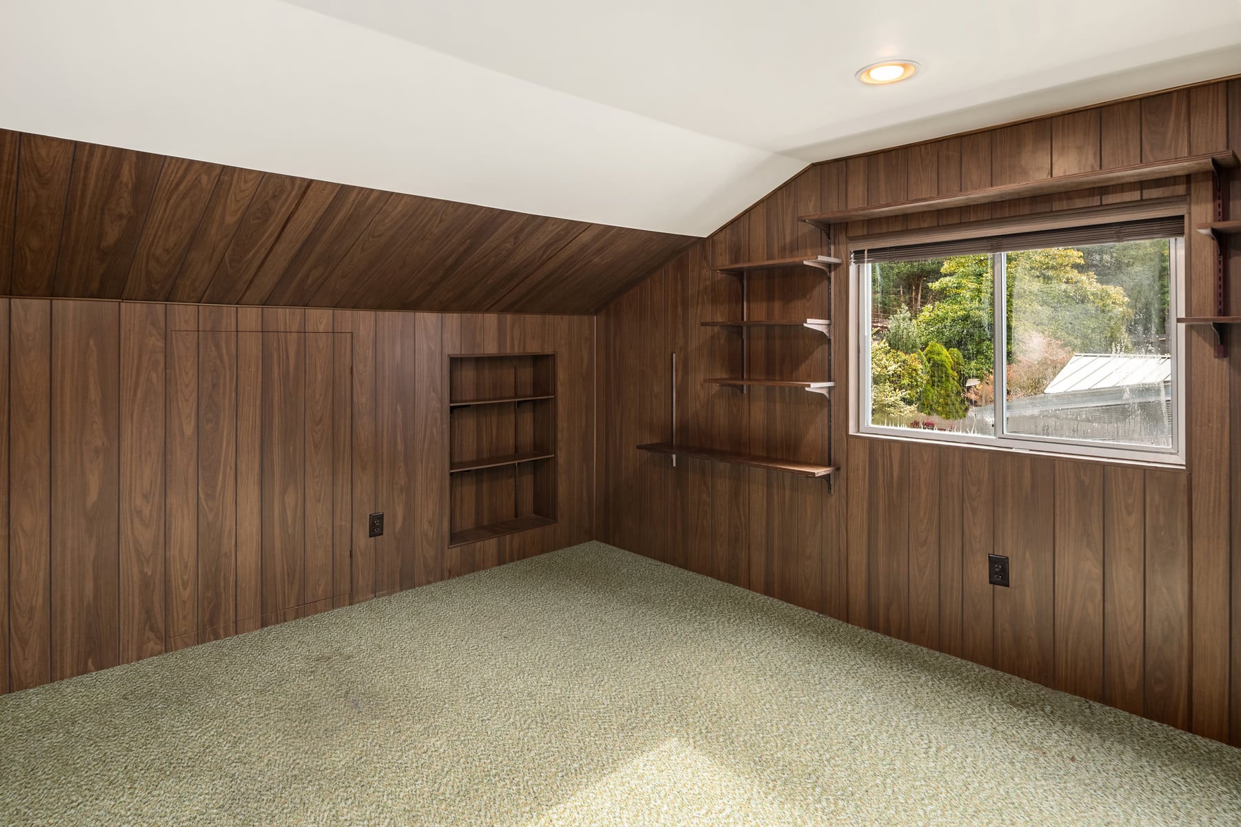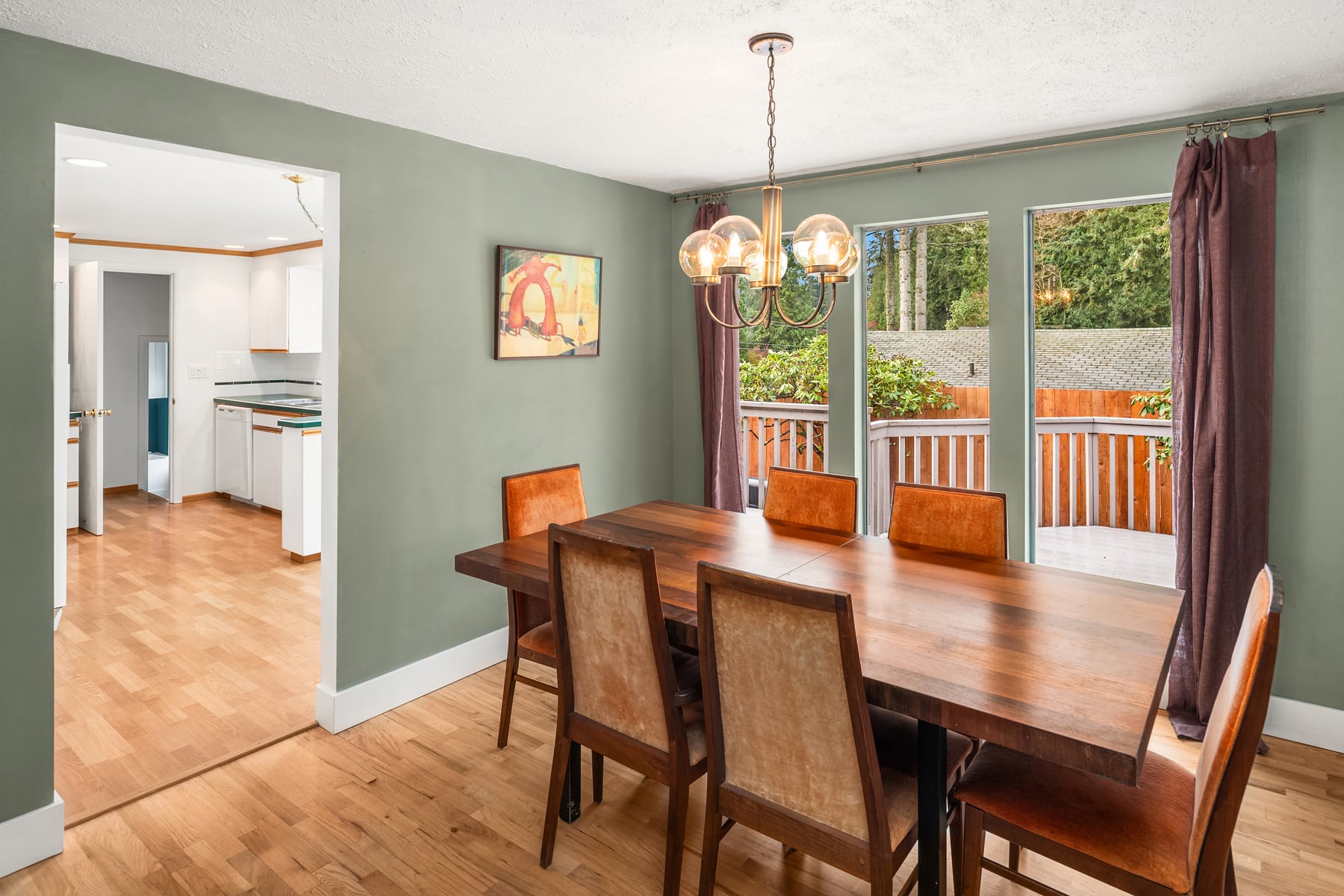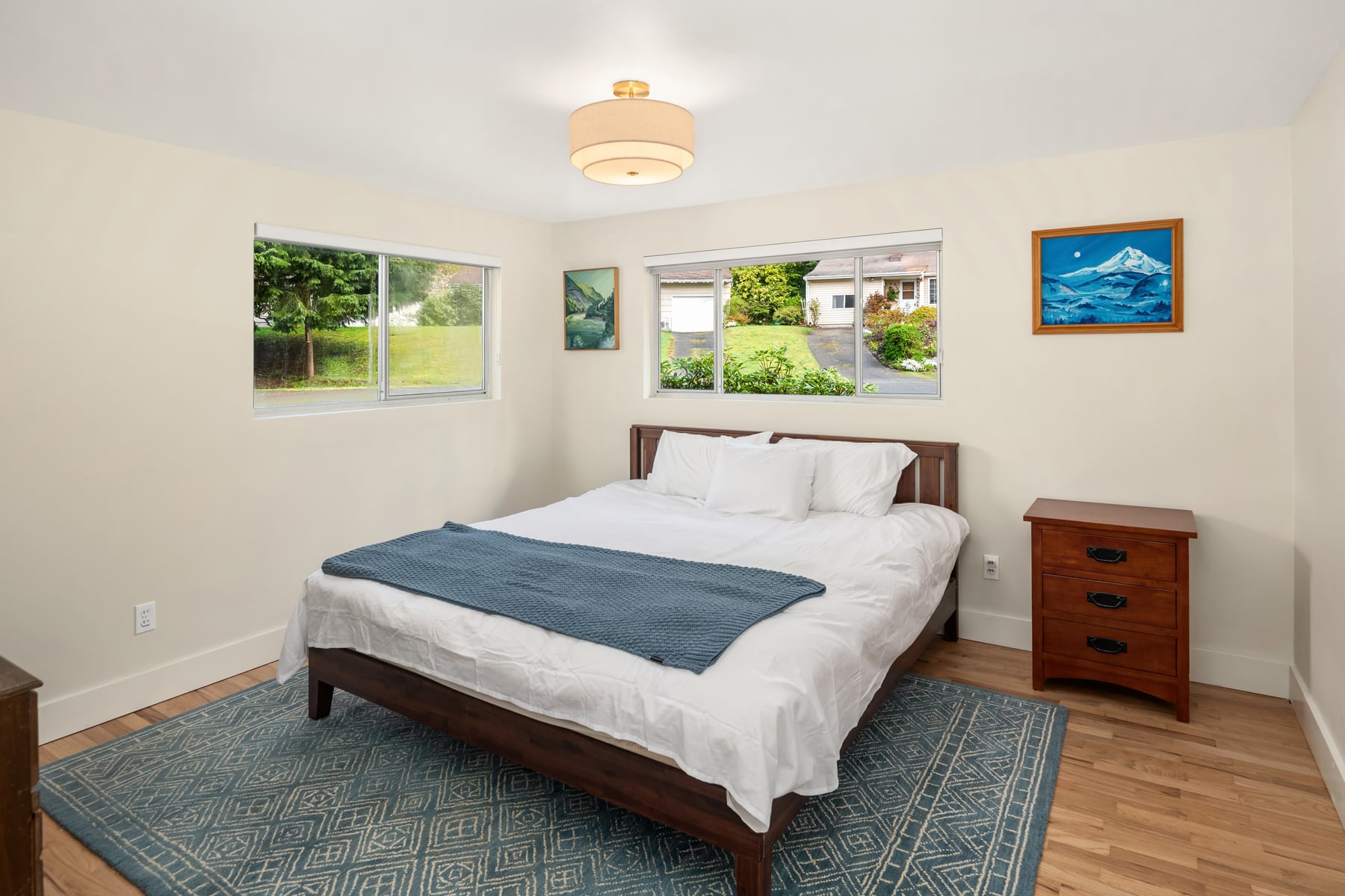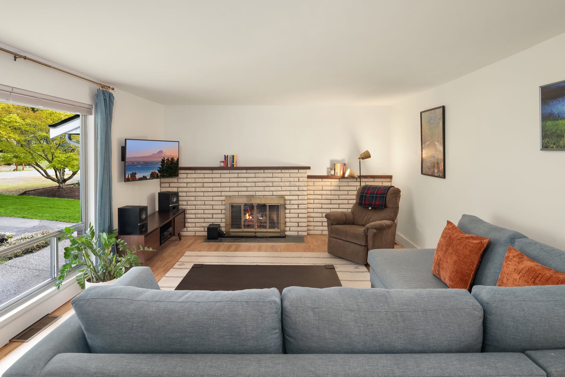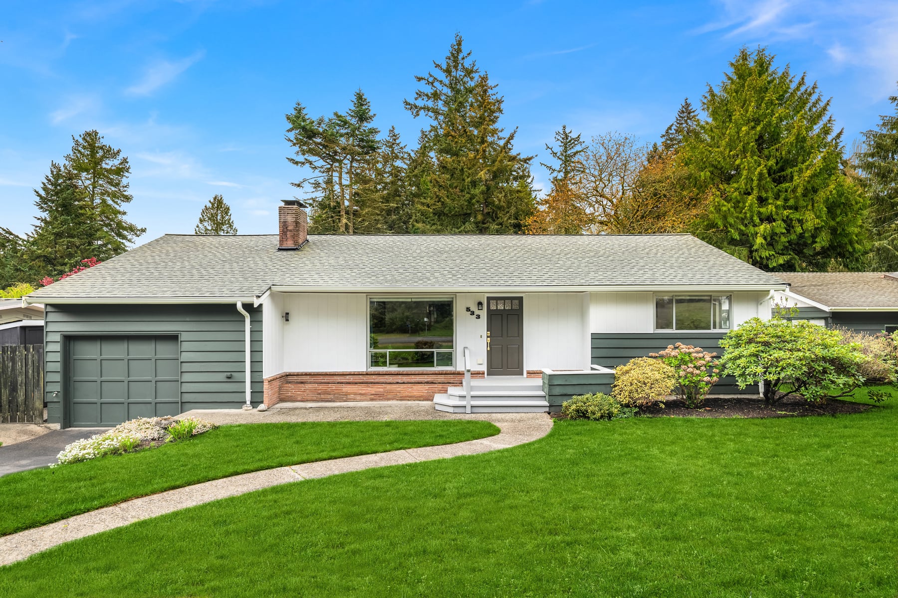 Quietly tucked away on a sprawling corner lot in Richmond Highlands, this move-in ready mid-century rambler boasts a massive 590sf detached garage + towering RV carport with utility hookups! Striking vintage curb appeal with two-tone designer paint, roman brick planter & raised front porch. Newly refinished light oak hardwoods, upscale millwork with 6" baseboards & fresh paint throughout. Slate foyer opens to spacious living room with huge picture window & impressive wall-to-wall brick fireplace. Spacious formal dining with stunning floor-to-ceiling windows. Custom kitchen with sleek euro cabinets, crown molding & breakfast nook with slider to sweeping entertainment deck. Two generous bedrooms with corner windows on main floor + upper 3rd bedroom/bonus room with open rail staircase. Private backyard with extended patio, mature gardens & potting shed. New high-efficiency furnace with heat pump & central A/C. This lovingly cared for gem is a very special find!