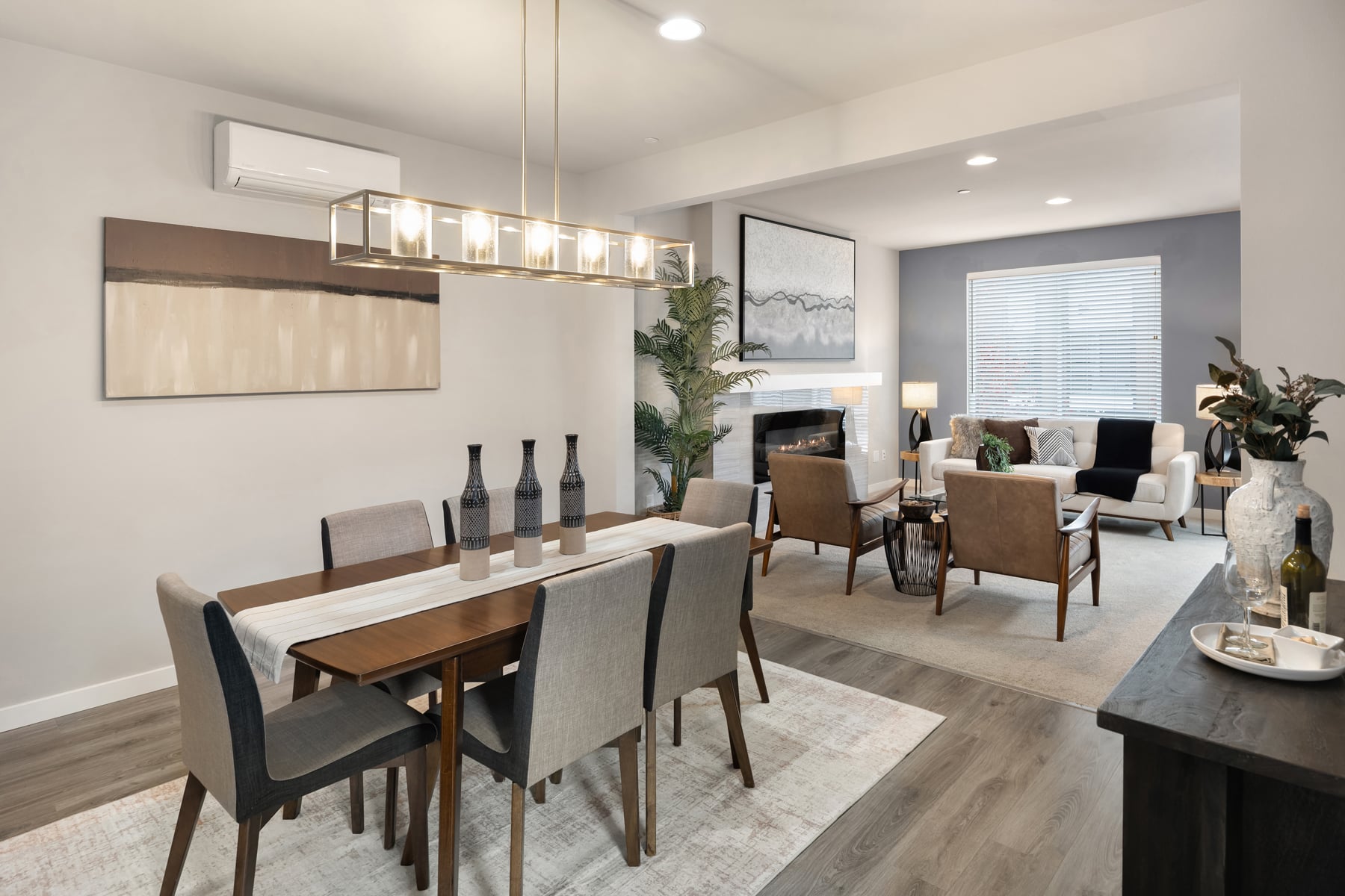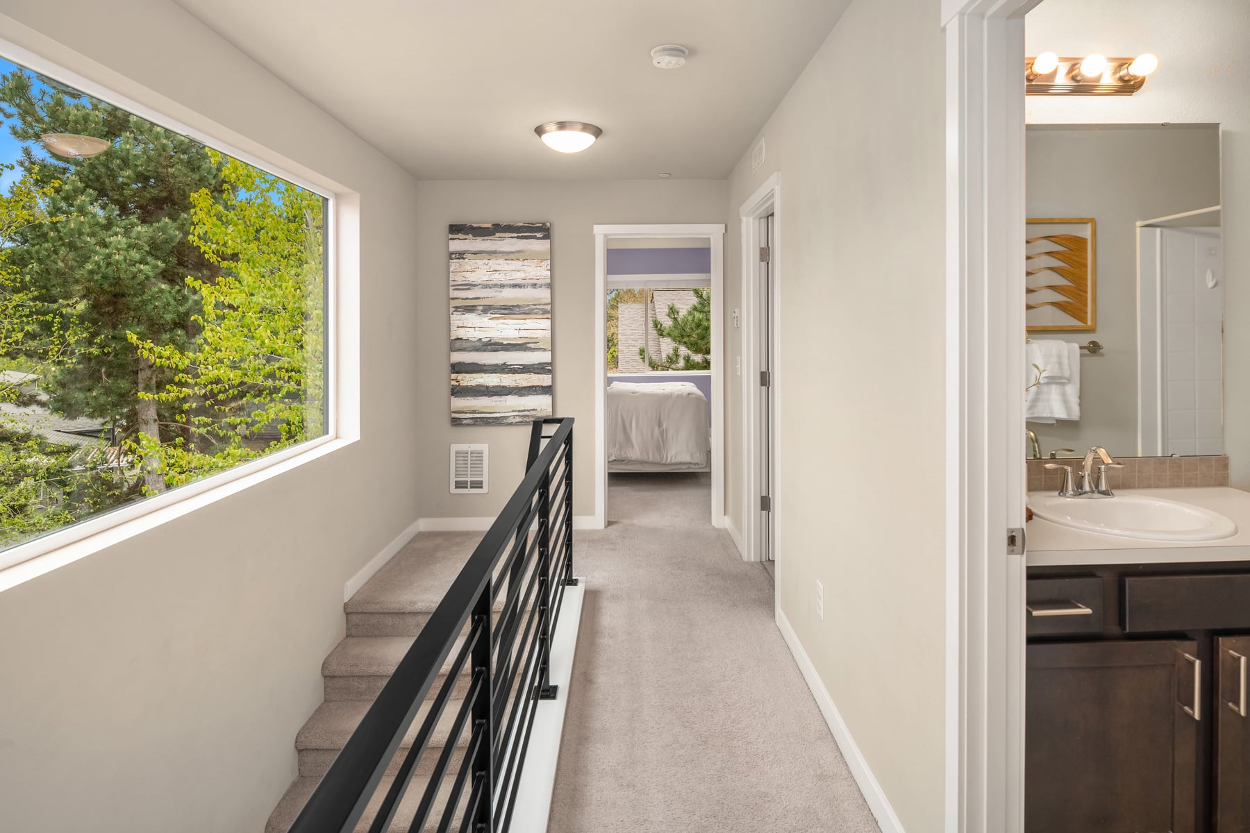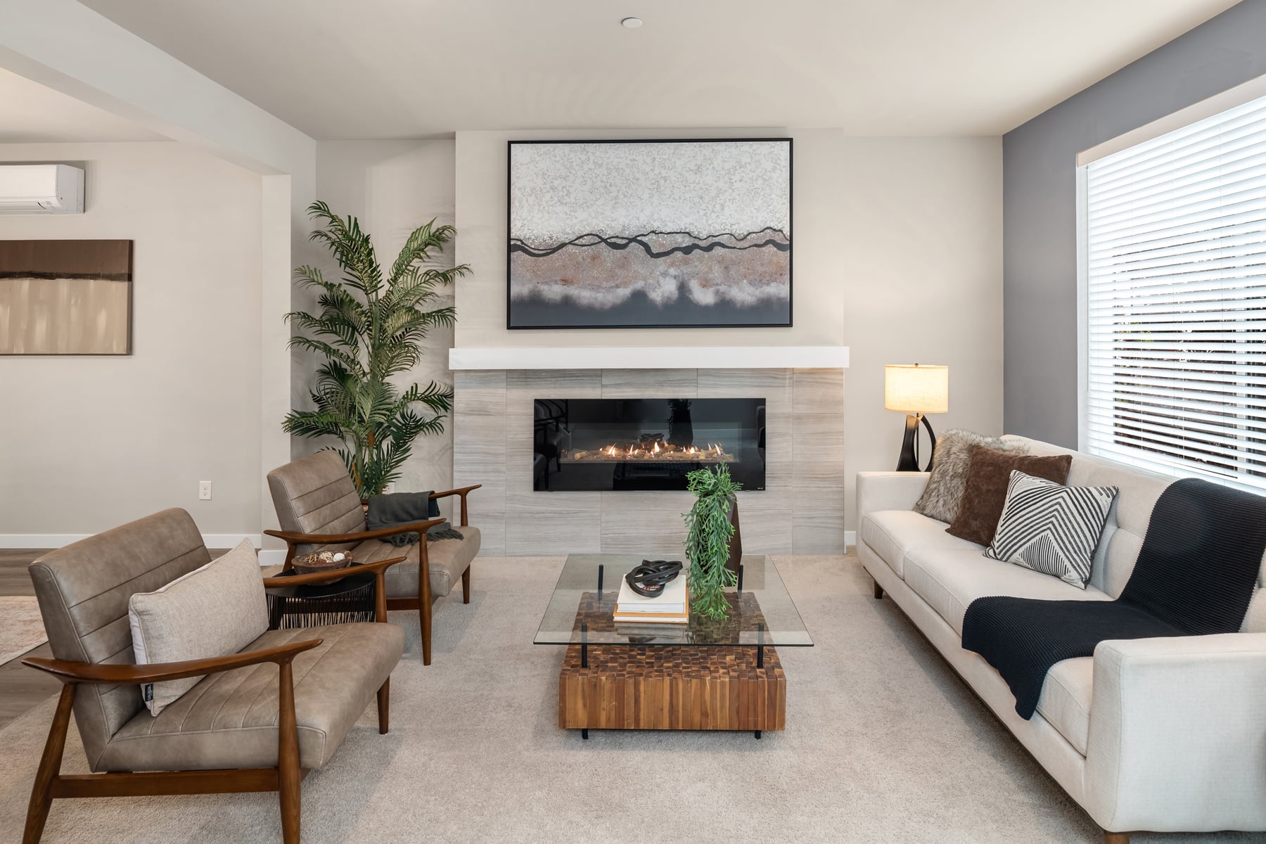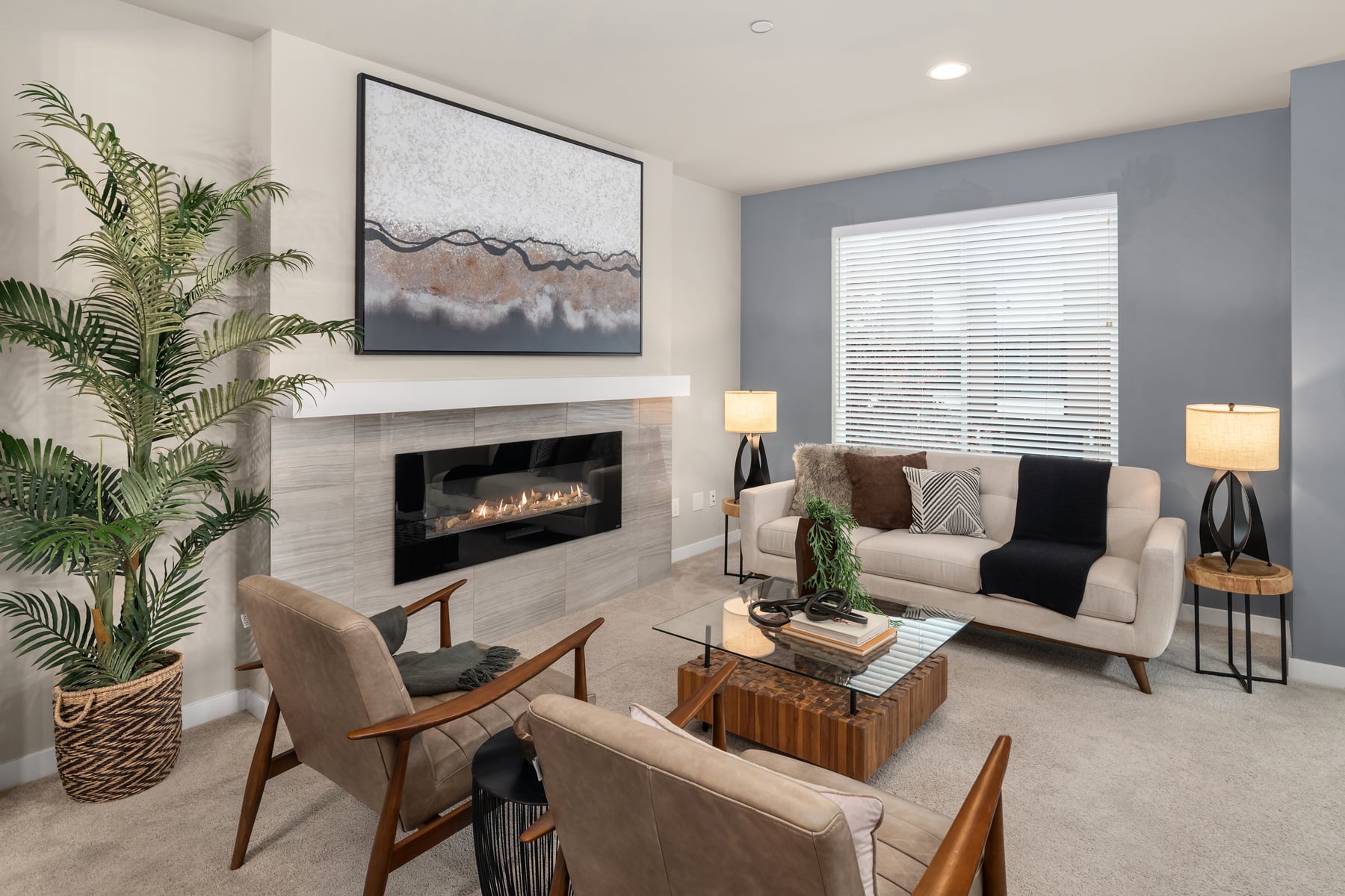 Securely tucked away in a sought-after gated community, this luxurious 2019 end-unit townhome is a move-in ready masterpiece boasting impressive curb appeal & stunning modern finishes with a sprawling 2-car garage, driveway & super low HOA dues! Lavishly appointed 1,548sf, 3 bed, 2.5 bath design features a desirable open concept layout with tall ceilings, oversized windows & horizontal open rail staircases throughout. Light-filled living room with captivating linear fireplace opens spacious formal dining & high-end dream kitchen with rich solid wood cabinetry, gorgeous quartz counters, full-height tiled backsplash, gas range, stainless steel appliances, peninsula bar & private covered balcony. The primary suite dazzles with generous walk-in closet & dramatic tiled bath with dual-sink quartz vanity & glass enclosed shower. Full-size utility room, abundant storage space, on-demand hot water & efficient A/C. Covered patio + backyard space with upside potential. Attractive neighborhood with fenced-in playground, ample guest parking & no rental cap!